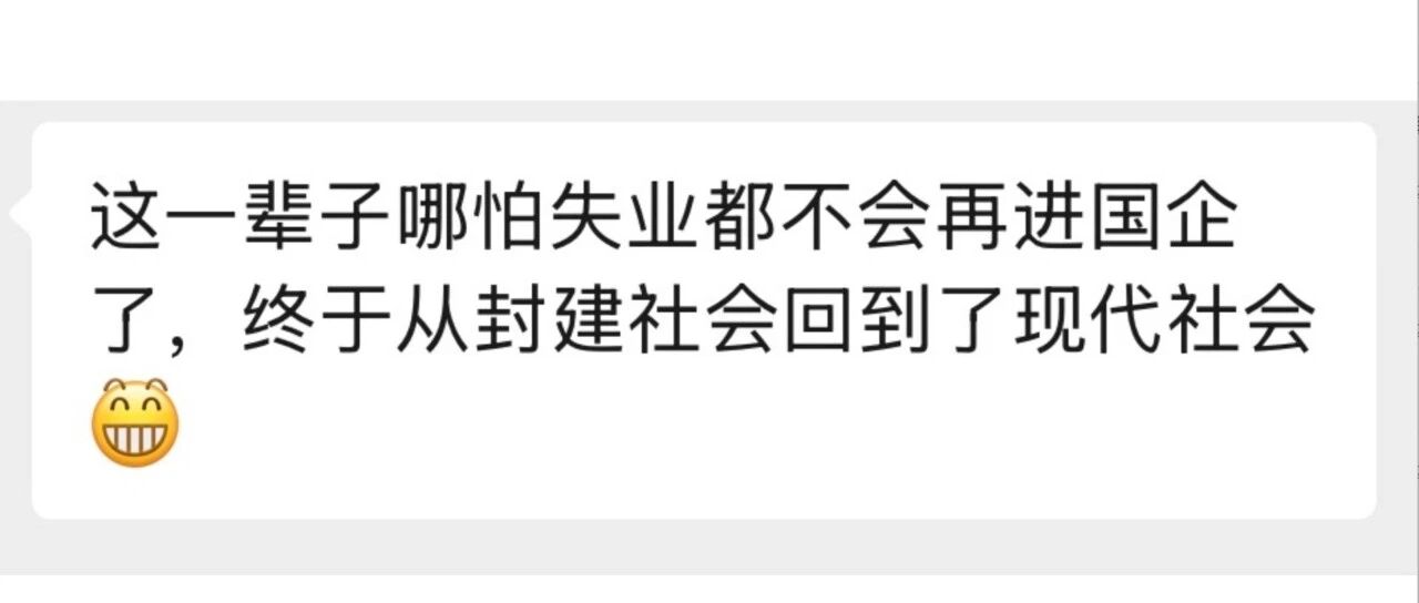 大家好,我是佩妮。 本篇内容其实来自之前我们社群内的一次讨论,缘起是有位国资群友终于离职了,跟我感叹了一下: 我知道 ta 已经在国资好多年了,这个形容,怎么说呢,激起了我这个一辈子只都在纯纯市场化行业的工作过,且知道自己从来不适合体制的人 的好奇心…… 于是有了以下对话: 我把这个话题抛到了群里,炸出了很多潜水的国资群友,我觉得也挺有收获的。 也有一位群友是这样说的: 国资部门只是国企或者体制中的一小部分,但是也许对所有在国央企和体制内工作的朋友有一些意义,所以我就 把讨论的一些点摘出来了。 我完全中立。群友 个人的经验难免片面 ,我相信一定也有如鱼得水的朋友,轻拍哈哈哈。 观点摘要: 1)国企的好处:会遇到一些优秀的同事, 注意,不是领导 。这么多年看下来,德才兼备的领导是半个都没有……(仅代表个人) 我的感受是,其实大家都非常聪明,能力都很强。但在这个体制里面,你很多时候不得不去做让自己利益最大化的事,哪怕这个事很匪夷所 思,看上去很不聪明。 3)有人说 在体制内只要你不追求进步你就是大爷 。不过, 是否可以一直躺下去未知,看后台一直在不在,看看公司领导班子换届,新领导什 么思路,如果后台退了要不要继续 ...