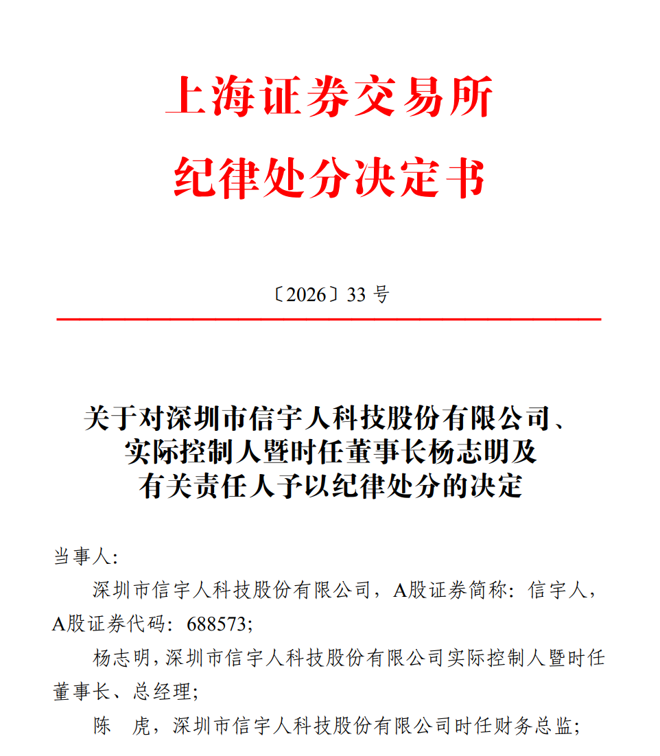 上交所官网2月27日发布了对信宇人的两则纪律处分决定:信宇人以及时任财务总监陈虎,时任财务总监、董 事会秘书余德山被上交所予以通报批评,同时实际控制人暨时任董事长、总经理杨志明被予以公开谴责。 | 证券代码 | 证券简称 监管英型 | 处理事由 | 涉及对象 | 处理日期 | | --- | --- | --- | --- | --- | | 688573 | 信宇人 通报批评 | 关于对深圳市信宇人科技股份有限 | 财务总监,董秘,上 2026-02-27 | | | | | 公司、实际控制人暨时任董事长杨 | 市公司 | | | | | 志明及有关责任人予以纪律处分的 | | | | | | 决定 | | | | 688573 | 信宇人 公开谴责 | 关于对深圳市信宇人科技股份有限 | 实际控制人 | 2026-02-27 | | | | 公司、实际控制人暨时任董事长杨 | | | | | | 志明及有关责任人予以纪律处分的 | | | | | | 決定 | | | 具体来看,上市公司及相关主体存在以下违规行为:根据深圳市信宇人科技股份有限公司(以下简称信宇人 或者公司)于2025年12月13日披露的《 ...