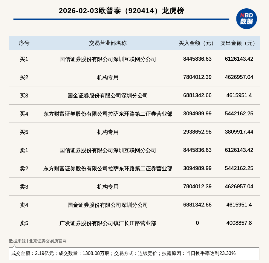 每经讯,2026年2月3日,北交所上市公司欧普泰(920414,收盘价:17.12元)登上龙虎榜,交易方式是连续竞价,披露原因是 当日换手率达到23.33%,成交数量1308.08万股,成交金额2.19亿元。买一席位为国信证券股份有限公司深圳互联网分公司,买 入844.58万元;卖一席位为国信证券股份有限公司深圳互联网分公司,卖出612.61万元。 | | 2026-02-03欧普泰 (920414) 龙虎榜 | | | | --- | --- | --- | --- | | 序号 | 交易营业部名称 | 买入金额(元) | 卖出金额(元) | | ਜੇਟ ਹ | 国信证券股份有限公司深圳互联网分公司 | 8445836.63 | 6126143.42 | | 买2 | 机构专用 | 7804012.39 | 4626957.04 | | 考3 | 国金证券股份有限公司深圳分公司 | 6881342.66 | 4615951.4 | | ग्रेट प | 东方财富证券股份有限公司拉萨东环路第二证券营业部 | 3094989.99 | 5442162.25 | | જેટ | 机构专用 | 2938652.9 ...