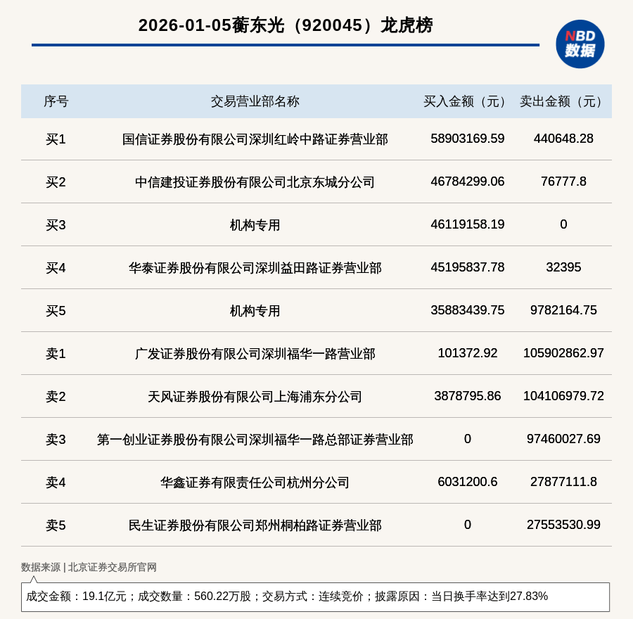Core Insights - On January 5, 2026, the company Hengtong Optoelectronics (stock code: 920045) was featured on the trading leaderboard due to a turnover rate of 27.83% and a trading volume of 5.6022 million shares, amounting to a total transaction value of 1.91 billion yuan [1]. Trading Activity Summary - The top buying seat was from Guosen Securities Co., Ltd., Shenzhen Hongling Middle Road Securities Business Department, with a purchase amount of approximately 58.90 million yuan [2]. - The top selling seat was from GF Securities Co., Ltd., Shenzhen Fuhua First Road Securities Business Department, with a selling amount of approximately 106 million yuan [2]. - Other notable buying activities included CITIC Securities Co., Ltd., Beijing Dongcheng Branch, with a purchase of approximately 46.78 million yuan, and institutional investors with a total purchase of approximately 46.12 million yuan [2].