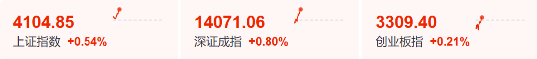 大家好!又到周五,来一起关注最新的市场行情和资讯 ~ 1月9日,A股三大指数开盘涨跌不一:沪指微涨0.09%,深成指跌0.3%,创业板指跌0.69%。开盘后市场震荡拉升,截至发稿,沪指成功 站上4100点,A股主要指数集体飘红。 | 4104.85 | 14071.06 | | 3309.40 | | | | --- | --- | --- | --- | --- | --- | | 上证指数 +0.54% | 深证成指 +0.80% | | 创业板指 +0.21% | | | | 1455.88 + ---- | 3132.40 7 ---- | | 4751.08 } ---- | 1531.16 1 ... | | | 科创50 +0.05% | 上证50 +0.33% | | 沪深300 +0.28% | 北证50 +1.51% | | | 上证指数(SH:000001) | | | | 88 加自选 | | | 4104.85 +21.87 +0.54% | | | | 162.81 万球友关注 交易中 01-09 10:00:32 北京时间 | | | 最高:4106.58 | 今开:4086.7 ...