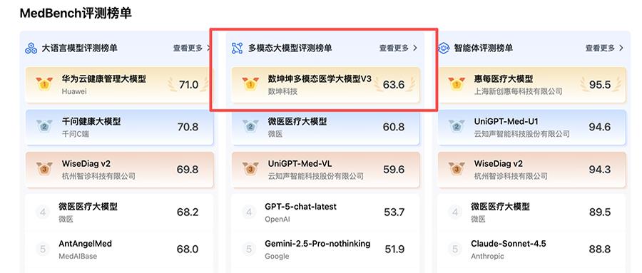| 。大语言模型评测榜单 | | 壹看更多 | ~ 多模态大模型评测榜单 | 查看更多 > | 2 智能体评测榜单 | 查看更多 | | --- | --- | --- | --- | --- | --- | --- | | 20 | 华为云健康管理大模型 | 71.0 | 数坤坤多模态医学大模型V3 83 | 63.6 | 惠每医疗大模型 Pas | 95.5 | | | Huawei | | 数坤科技 | | 上海新创惠每科技有限公司 | | | 127 | 千问健康大模型 | 70.8 | 微医医疗大模型 25 | 60.8 | UniGPT-Med-U1 (2) | 94.6 | | | 千间C端 | | 微医 | | 云知声智能科技股份有限公司 | | | 37 | WiseDiag v2 | 69.8 | UniGPT-Med-VL 735 | 59.6 | WiseDiag v2 R35 | 94.3 | | | 杭州智诊科技有限公司 | | 云知声智能科技股份有限公司 | | 杭州智诊科技有限公司 | | | | 微医医疗大模型 | 68.2 | GPT-5-chat-latest A | 5 ...