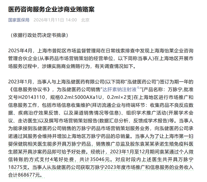 销售总监微信转账3.5万元给医生,医生一年开药1.8万支,国家医保局网站通报一起医药咨询服务企业 涉商业贿赂案。 1月11日,国家医保局网站依据行政处罚决定书通报了上述案例,据通报,2023年1月,上海海怡莱企业 咨询管理合伙企业(下称海怡莱公司)与上海泓健医药有限公司(以下简称"泓健医药公司")签订为期一 年的信息服务协议,为泓健医药公司销售"达肝素钠注射液"(产品名称:万脉宁,规格 0.2ml:5000AXa1U,0.2ml×2支)在上海地区进行市场推广和信息服务工作。 主营药品市场营销策划的海怡莱公司,日常主要工作包括拜访流通企业与终端环节、收集药品不良反应 数据、疾病治疗效果反馈、组织开展学术会议、走访医生,以及撰写市场营销策划报告等。海怡莱公司 为能承接到泓健医药公司销售的万脉宁药品市场营销策划服务业务,向泓健医药公司承诺通过其服务会 维持并增加上海地区万脉宁药品的总销量。 针对上述案件,国家医保局再次强调,医药商业贿赂本质上是通过给予不正当利益影响处方权,干扰正 常诊疗行为,妨碍公平竞争,加重医药负担。该案件中,受贿人作为临床一线医务人员,其开具处方并 非从实际临床价值和产品质量疗效出发,而是利用 ...