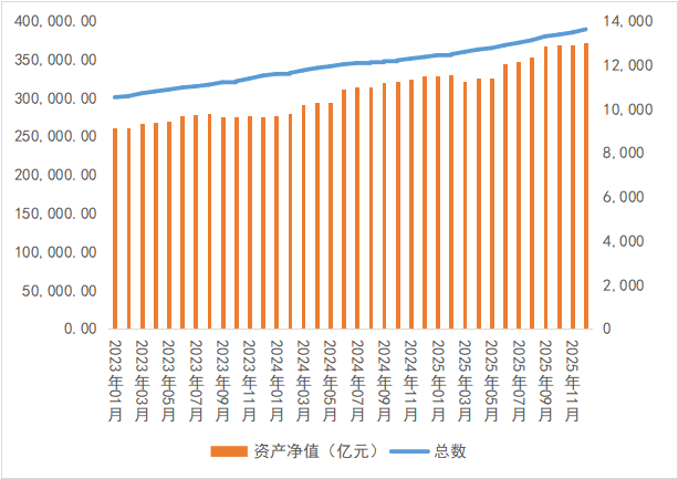 来源:中诚信托诚财富 热点研究 2025年四季度,受国内经济保持回升向好趋势,美联储降息和购债等因素影响,公募基金净值同比增速保持快速 增长,新成立基金份额发行份额逐月反弹,FOF类基金发行规模逆势激增。从业绩表现上来看,股票类基金业绩 增速放缓,被动指数型基金行业与风格分化显著,债券基金表现回暖,商品型基金中白银表现强势。展望下一阶 段,作为"十五五规划"的开局之年,2026年国内经济坚持"稳中求进、提质增效"的总基调,外部流动性也从偏紧 转向宽松,资产配置策略可保持适度积极,增加权益类资产配置比重。 四季度公募基金市场的总体特征 整体来看,受国内经济保持回升向好趋势,以及美联储降息和购债等因素影响,四季度国内股票市场呈现分化震 荡格局,债券市场整体调整,公募基金净值同比增速保持快速增长,新发基金份额逐月反弹。在新发行基金结构 上,股票类基金占比保持稳定,债券类基金占比年底反弹,FOF类基金发行规模逆势激增。 (一)公募基金净值同比增速保持快速增长 截至12月31日,四季度公募基金总体规模已达316492.31亿份,同环比增速为5.03%、1.89%,同比增速较上一季 度小幅回落,环比增速有所加快(三季度同 ...