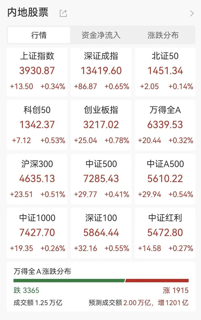 12月23日,A股早盘震荡拉升,截至收盘,沪指涨0.34%,深成指涨0.65%,创业板指涨0.78%。沪深两市半日成交额1.25万亿,较上个交易日放量523 亿。盘面上热点快速轮动,全市场超3300只个股下跌。 | 内地股票 | | | | --- | --- | --- | | 行情 | 资金净流入 | 涨跌分布 | | 上证指数 | 深证成指 | 北证50 | | 3930.87 | 13419.60 | 1451.34 | | +13.50 +0.34% +86.87 +0.65% +2.05 +0.14% | | | | 科创50 | 创业板指 | 万得全A | | 1342.37 | 3217.02 | 6339.53 | | +7.12 +0.53% +25.04 +0.78% +20.44 +0.32% | | | | 沪深300 | 中证500 | 中证A500 | | 4635.13 | 7285.43 | 5610.22 | | +23.51 +0.51% +29.77 +0.41% +29.94 +0.54% | | | | 中证1000 | 深证100 | 中证红利 | | 7427. ...