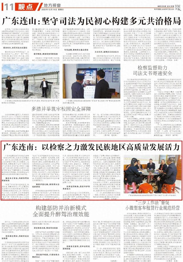 |11 靓点 / 世方视窗 广东连山:坚守司法为民初心构建多元共治格局 理进行权官之代居所法 检察监督助力 司法文书寄递安全 广东连南:以检察之力激发民族地区高质量发展活力 . 步上作法 管促 小微型客车租赁行业规范乡 《检察日报》 2025年12月19日第11版 广东省连南瑶族自治县是全国唯一的排瑶聚居地,民族文化底蕴深厚。近年来,连南瑶族自治县检察院 立足民族地区实际,深入挖掘本土治理资源,创新探索并运用"检察+瑶老"工作机制,打造"瑶乡检韵· 和融共治"文化品牌,将现代法治精神与瑶族传统"瑶老"智慧相融合,有效破解基层社会治理难题,为 民族地区法治建设与社会和谐稳定提供有益经验。 构建惩防并治新模式 全面提升醉驾治理效能 NE: 对外国 权利少年 11 12 广东省连南瑶族自治县检察院检察干警与"瑶老"对当事人释法说理。 融合本土智慧,构建协同治理新格局 "瑶老"作为瑶寨中德高望重、熟悉民情、善断纠纷的长者,在基层社会治理中具有独特的威望和优势。 为破解民族地区司法工作中面临的语言不通、习俗差异、信任难构建等难题,连南瑶族自治县检察院主 动将"瑶老"这一传统治理力量引入检察履职,构建起检察机关专业引领与 ...