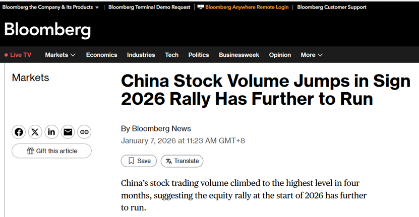 【环球网财经综合报道】数据显示,截至2026年1月7日,A股市场两融余额达26047亿元,首次突破2.6万亿元大关, 并创出历史新高,单日增长约248亿元。自2025年12月22日以来,短短11个交易日,两融余额累计已增长超过1000亿 元。 报道还提到,展望2026年底,摩根士丹利中国指数(MSCI China Index)预计将从2025年收盘水平上涨20%,达到 100,而沪深300指数(CSI 300 Index)则将达到5200点,涨幅为12%。高盛等多家机构表示:"预计2026年的股市收益几 乎完全由盈利驱动,盈利增长将得益于人工智能、走向全球化以及反垄断政策"。 此外,分析师还预计,年内中国内地投资者南向资金对港股的净买入将达到2000亿美元,再创纪录;同时,外国投资 者可能减少对中国的股市空仓,可能推动1000亿美元的资金流入。 彭博社近日发文称,中国股市成交量达到四个月最高点,达2.8万亿元,创2025年9月来纪录,暗示年初反弹仍有空 间。沪深300指数收于四年高位,券商等相关股票涨幅明显;近七成股票在年内前两个交易日上涨,显示出市场活跃 和上涨动力。 ...