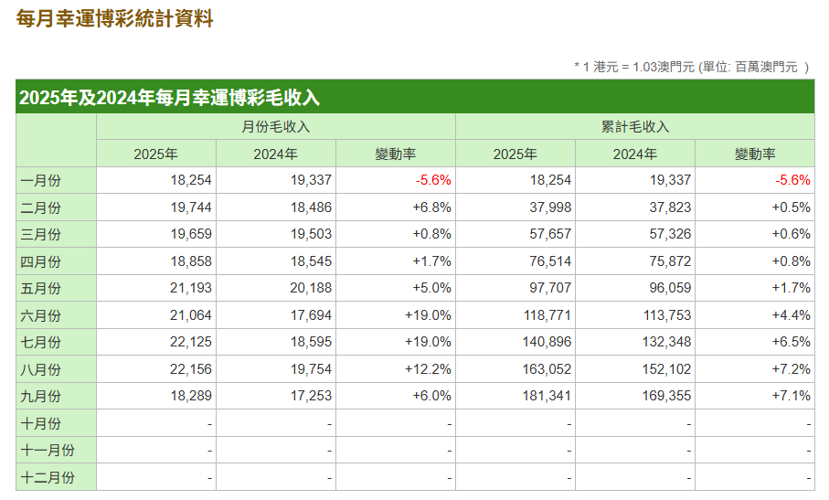 智通财经APP获悉,10月1日,澳门博彩监察协调局公布,9月份澳门幸运博彩毛收入为182.89亿澳门元,同比增长6%。今年前9 个月澳门博彩毛收入累计达1813.41亿澳门元,同比升7.1%。 | | 2025年及2024年每月幸運博彩毛收入 | | | | | | | --- | --- | --- | --- | --- | --- | --- | | | | 月份毛收入 | | | 累計毛收入 | | | | 2025年 | 2024年 | 炭動率 | 2025年 | 2024年 | 變動率 | | 一月份 | 18,254 | 19,337 | -5.6% | 18,254 | 19,337 | -5.6% | | 二月份 | 19,744 | 18,486 | +6.8% | 37,998 | 37.823 | +0.5% | | 三月份 | 19.659 | 19.503 | +0.8% | 57,657 | 57,326 | +0.6% | | 四月份 | 18,858 | 18.545 | +1.7% | 76.514 | 75.872 | +0.8% | | 五月份 | 21.193 | 2 ...