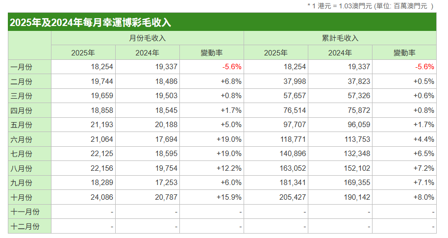 | | 2025年及2024年每月幸運博彩毛收入 | | | | | | | --- | --- | --- | --- | --- | --- | --- | | | | 月份毛收入 | | | 累計毛收入 | | | | 2025年 | 2024年 | 變動率 | 2025年 | 2024年 | 變動率 | | 一月份 | 18,254 | 19,337 | -5.6% | 18,254 | 19,337 | -5.6% | | 二月份 | 19.744 | 18.486 | +6.8% | 37,998 | 37.823 | +0.5% | | 三月份 | 19,659 | 19,503 | +0.8% | 57,657 | 57,326 | +0.6% | | 四月份 | 18.858 | 18,545 | +1.7% | 76,514 | 75.872 | +0.8% | | 五月份 | 21.193 | 20.188 | +5.0% | 97,707 | 96,059 | +1.7% | | 六月份 | 21.064 | 17.694 | +19.0% | 118,771 | 113.753 | ...