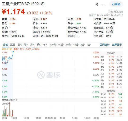 11月24日,卫星通信板块强势拉升。截至上午9时58分,卫星产业ETF(159218)放量上涨1.91%。成分股 光库科技、国机精工、新雷能、臻镭科技等涨幅居前,板块呈现普涨格局。 卫星产业ETF(159218)作为全市场首只跟踪中证卫星产业指数的标的,覆盖卫星制造、发射、导航通信 应用等全产业链环节。成分股包括中国卫星、中国卫通、臻镭科技等龙头企业,涵盖国防军工 (54%)、计算机(15.1%)、电子(12.2%)等高增长行业。在政策利好持续释放、产业发展加速的背 景下,配置价值持续凸显。 【产业发展目标明确,用户规模有望突破千万】 政策层面,卫星通信产业已有清晰顶层设计。今年8月底,工信部发布《关于优化业务准入促进卫星通 信产业发展的指导意见》,明确支持卫星物联网、卫星互联网及终端设备直连卫星业务发展,并提出到 2030年"发展卫星通信用户超千万"的具体目标。这一目标为产业发展划定了清晰路径,推动卫星通信 从"专业应用领域"向"大众消费市场"跨越。 【运营商全面布局,产业迎来成熟拐点】 需求端方面,卫星通信市场正全面激活。随着工信部向中国联通、中国移动颁发卫星移动通信业务经营 许可,三大通信运营商已悉数获 ...