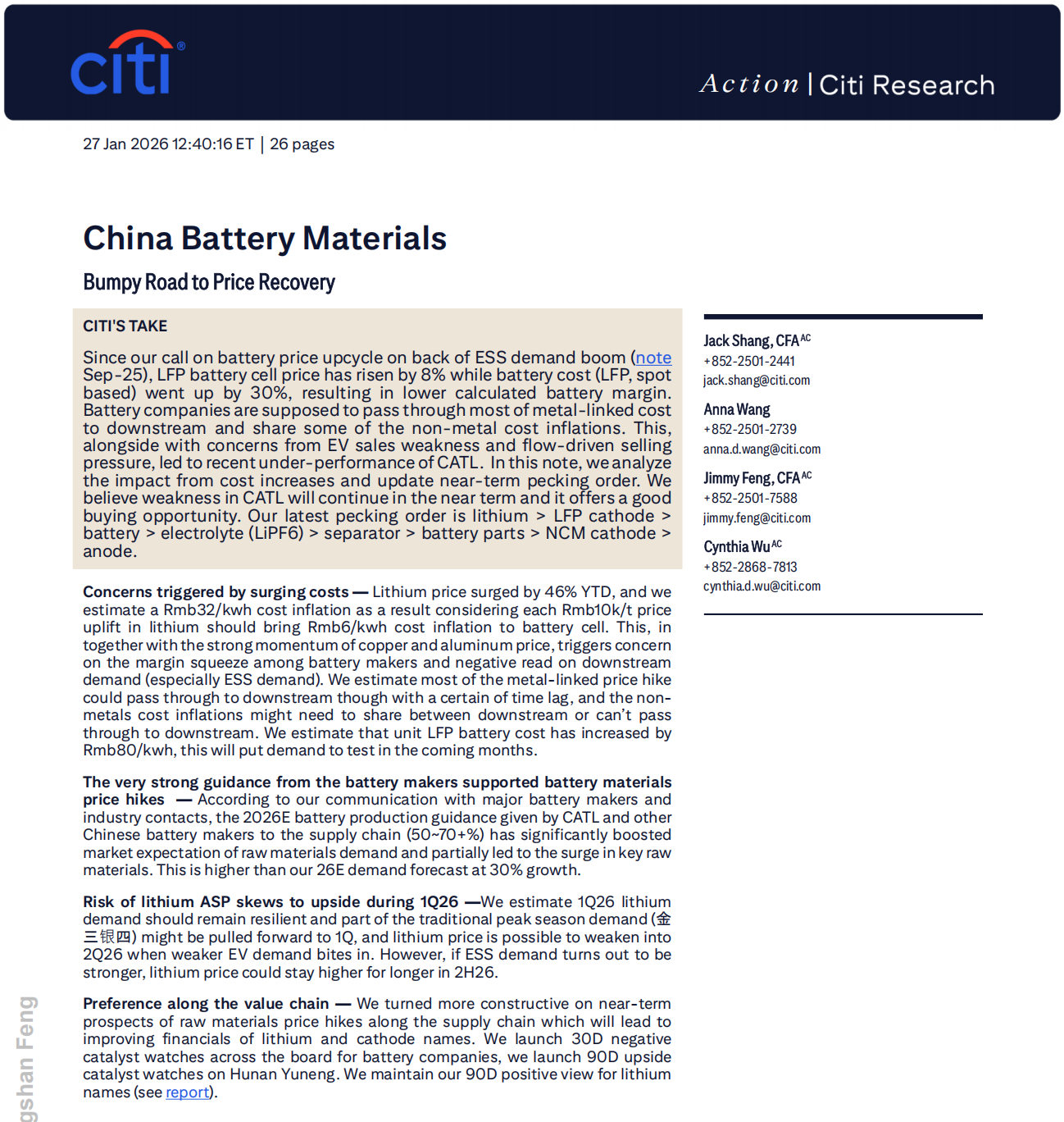 (文章来源:证券日报) 报告显示,自2025年9月花旗预判电池价格进入上行周期以来,磷酸铁锂(LFP)电池电芯价格上涨 8%,电池成本飙升30%,导致行业利润率承压。锂价年初至今已上涨46%,叠加铜、铝等金属价格走 强,进一步挤压了电池厂商的利润空间。但相对而言,宁德时代由于更早施行原材料价格联动机制,相 对定价权较弱的同业可以更为及时充分传导成本波动。 需求方面,花旗认为未来几个月的动力电池需求可能面临测试,但上调了对储能电池需求的预测,因此 维持全年总电池需求预测30%+的增速基本不变。 本报讯 1月27日,花旗最新发布的中国电池行业研究报告指出,尽管短期面临成本上涨与需求波动的压 力,宁德时代(CATL)当前的股价恰恰提供了良好的买入机会。 ...