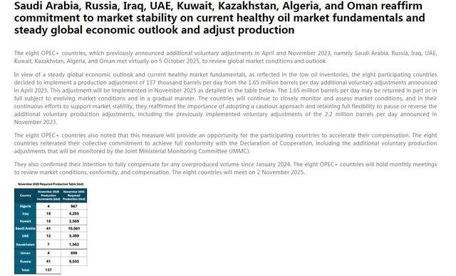 OPEC+决定11月增产13.7万桶原油。 在经过了激烈谈判后,产油国联盟欧佩克+(OPEC+)上周日宣布,将从11月开始每日增产13.7万桶原油。鉴于市场对潜在供应过剩的担忧持续存在, OPEC+此次选择与10月相同的温和增产幅度。由于规模低于此前外界预期,周一国际油价跳空高开超1%,脱离四个月低位,不过价格战风险、宏观经济前 景和季节性需求下滑可能成为压制油价的短期因素, 继续小幅增产 石油输出国组织(OPEC)官网声明表示,该组织认为全球经济前景稳定,且得益于当前较低的原油库存水平,市场基本面保持健康。 | November 2025 Required Production Table (kbd) | | | | --- | --- | --- | | Country | November 2025 Production | November 2025 Required Increments (kbd) Production (kbd) | | Algeria | 4 | 967 | | Iraq | 18 | 4,255 | | Kuwait | 10 | 2,569 | | Saudi Arabla ...