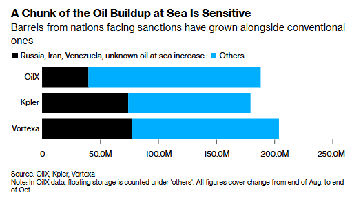 智通财经APP获悉,目前,全球海域正积压着高达十亿桶的原油,其中来自受制裁国家的原油比例异常 之高。这一迹象表明,制裁措施正在对石油贸易造成相当程度的干扰。 Clarksons Securities包括Frode Morkedal在内的分析师写道:"部分库存增长源于西方制裁的收紧,导致 俄罗斯原油滞留船上无法卸载。此前的买家已转而从中东和大西洋地区采购替代原油。" 根据对船舶追踪机构数据的分析显示,受限制原油的积压主要来自俄罗斯供应。 最近几周,俄罗斯海上石油运输量有所上升。随着该国与欧佩克+产油国盟友逐步取消此前的减产措 施,石油产量持续增加。此外,乌克兰对俄罗斯石油基础设施(尤其是炼油厂)的袭击,可能导致部分原 油被转移至出口终端。 据Vortexa、Kpler和OilX三家机构的船舶追踪数据显示,8月底以来,海上油轮的原油库存大幅增加,其 中俄罗斯、伊朗、委内瑞拉产出或来源不明的原油占增量的比例最高约达40%。即便按最低估算的20% 计算,这一占比也超过了上述三国在全球原油产量中的份额。 这种积压并不意味着这些原油永远无法售出,但会对受制裁产油国的收入构成威胁,并进一步影响本就 预计将走向供应过剩的全球 ...