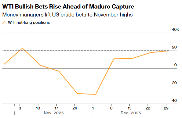 此前,美国对委内瑞拉石油出口的打压加剧了人们对美国将对这个能源丰富的国家采取更多军事行动的 预期。尽管委内瑞拉的石油出口量仅占全球原油供应量的不到1%,但这笔收入却是马杜罗政府的财政 命脉。马杜罗上周末被美军抓获,并于周一在纽约法庭出庭,对毒品恐怖主义指控拒不认罪。 智通财经APP获悉,在美军逮捕委内瑞拉总统马杜罗的前一周,因为市场正在权衡有关美国即将对这个 南美国家发动陆地袭击的日益增长的猜测,对冲基金将原油多头头寸增至去年11月以来的最高水平。 CFTC的数据显示,截至12月30日当周,基金经理对美国基准原油的净多头头寸增加了2045手,达到 19711手,创两个月来最大增幅。ICE Futures Europe的数据显示,对冲基金对布伦特原油的多头头寸升 至四周以来的最高水平。 与此同时,由美国主导的旨在结束俄罗斯在乌克兰战争的谈判面临新的复杂局面,这削弱了投资者对俄 罗斯原油短期内自由流通的信心。俄罗斯总统普京在声称乌克兰无人机袭击了他的住所后表示,他将调 整俄罗斯的谈判立场。 这份数据是政府停摆导致美国商品期货交易委员会(CFTC)运营中断、大量交易商持仓报告积压后发布 的首批最新报告之一。目前,报 ...