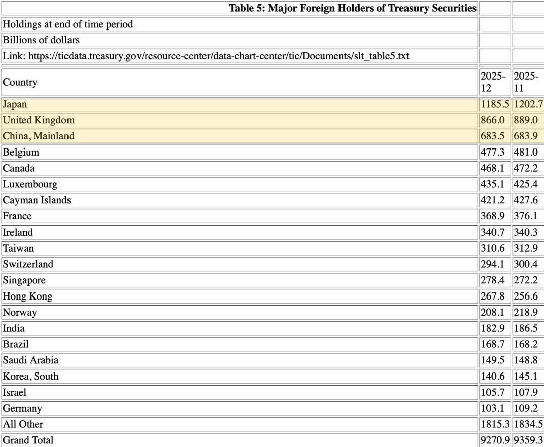 Core Viewpoint - The December 2025 TIC report reveals significant reductions in U.S. Treasury holdings by major foreign holders, indicating a shift in investment strategies among global investors [1][2]. Group 1: Major Foreign Holders' Actions - In December 2025, 14 major countries and regions collectively reduced their U.S. Treasury holdings by $88.4 billion, bringing the total foreign holdings down to $9.27 trillion [2]. - The top three foreign holders—Japan, the United Kingdom, and China—each decreased their U.S. Treasury holdings, with Japan reducing by $17.2 billion to $1.1855 trillion, the UK by $23 billion to $866 billion, and China by $0.4 billion to $683.5 billion, marking its lowest level since 2008 [3][4]. Group 2: Broader Market Implications - The overall reduction in U.S. Treasury holdings is attributed to factors such as the rapid expansion of federal debt, ambiguous Federal Reserve policies, and ongoing trade tensions under the Trump administration [5]. - Despite a net buying trend from overseas investors, there is a notable structural divergence, with significant sell-offs from entities like Denmark's pension fund and the Netherlands' largest pension fund, raising concerns in the market [5]. Group 3: Shift in Investment Preferences - U.S. Treasury securities are facing pressure as global investors seek diversification, with some describing the trend as a "quiet" sell-off of U.S. bonds [6]. - There is a growing preference for gold among central banks, with the IMF reporting that the dollar's share in global foreign exchange reserves has fallen below 60%, the lowest in decades, while central banks increased gold purchases by 863 tons in 2025 [6].