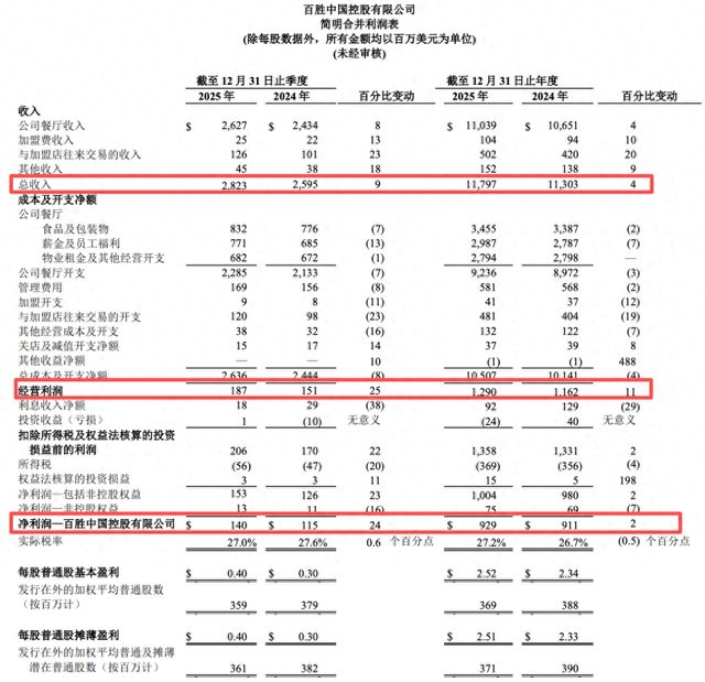 来源:智通财经 外卖大战下,百胜中国去年利润率仍有所上涨,管理层称外卖业务占比将持续提升。 2月4日晚间,肯德基和必胜客中国内地连锁店运营商百胜中国(9987.HK,NYSE:YUMC)发布了截至 2025年12月31日的第四季度及全年财报。去年第四季度百胜中国总收入同比增长9%至28.23亿美元;经 营利润达1.87亿美元,同比增长25%;归母净利润为1.4亿美元,同比增长24%。其中,百胜中国同店销 售额连续第三个季度实现增长,同店交易量连续第十二个季度实现增长。 2025年全年,百胜中国总收入同比增长4%至117.97亿美元;经营利润达12.9亿美元,同比增长11%;归 母净利润为9.29亿美元,同比增长2%。 | | | | | PT + Public . L. BOOK | | | | | | --- | --- | --- | --- | --- | --- | --- | --- | --- | | | | 截至 12月 31 日止拳度 | | | | 截至 12月 31 日止年度 | | | | | | 2025年 | 2024年 | 百分比变动 | 2025年 | | 2024 年 | 百分 ...