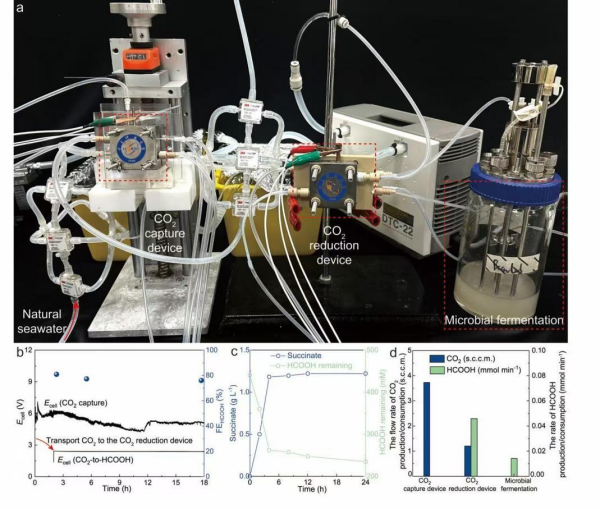 电催化 + 生物催化的集成系统。(科研团队供图) 高翔(右)与论文共同第一作者郭明明(左)交流实验结果。(科研团队供图) 海洋作为地球上最大的天然"碳库",每年吸收逾四分之一的人为排放二氧化碳,有效减缓了全球气 候变暖。然而,海水持续吸收二氧化碳引发的海洋酸化,对海洋生态平衡构成了严重威胁。如何把这部 分已进入海洋的碳,转化为人类可利用的资源,减缓海水酸化,是实现"蓝色经济"与"双碳"目标所必须 面对的共同命题。 10月6日,中国科学院深圳先进技术研究院定量合成生物学全国重点实验室、合成生物学研究所高 翔团队联合电子科技大学夏川团队,首次提出并验证了一种基于"电催化+生物催化"耦合策略的"人工海 洋碳循环系统",相关成果发表在国际学术期刊《自然·催化》。 该系统可捕集天然海水中的二氧化碳,并转化为可直接进入生物制造的中间体,再进一步升级为多 类高价值化学品与材料。该研究以可降解塑料单体为示范案例,有望为燃料、医药与食品配料等更广谱 产品提供生物制造平台。 破解海水高效捕碳难题 实验结果显示,该装置能在天然海水里连续稳定运行超过500小时,二氧化碳捕碳效率高达70%以 上,还可同步副产氢气。在经济性方面,每捕集 ...