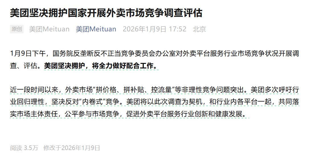 市场监管总局1月9日消息,国务院反垄断反不正当竞争委员会办公室有关负责同志表示,近段时间以来,外卖平台服务行业拼补贴、拼价格、控流量等问 题突出,挤压实体经济,加剧行业"内卷式"竞争,社会各方面反映强烈。为推动外卖平台依法合规经营、公平有序竞争,形成优质优价、良性竞争的市场 秩序,国务院反垄断反不正当竞争委员会办公室依据《中华人民共和国反垄断法》规定,决定对外卖平台服务行业市场竞争状况开展调查、评估。 本次调查评估是国务院反垄断反不正当竞争委员会办公室表达竞争关注、评估垄断风险、规范市场秩序的重要举措,将通过现场核实、当面访谈、问卷调 查等方式,深入了解外卖平台竞争行为,广泛听取平台内经营者、新就业群体、消费者等各方意见,全面调查市场竞争状况,组织开展分析论证,传导监 管压力,提出处置措施。外卖平台要积极配合市场调查、评估工作,严格落实反垄断合规主体责任,有效防范化解垄断风险,公平参与市场竞争,促进外 卖平台服务行业创新和健康发展。 9日晚,三大外卖平台均发文表示拥护支持此次调查。 美团表示,坚决拥护,将全力做好配合工作。美团多次呼吁行业回归理性,坚决反对"内卷式"竞争。美团将以此次调查为契机,和行业内各平台 ...