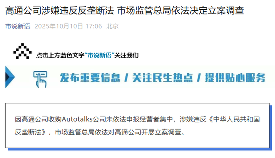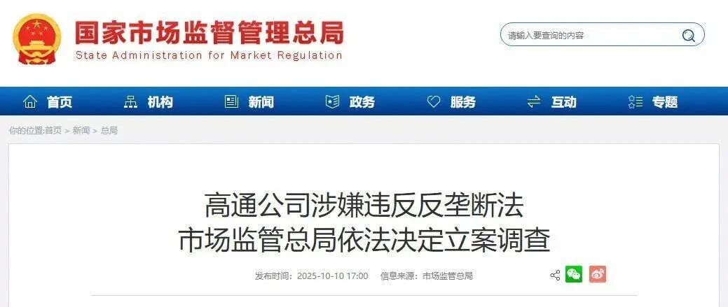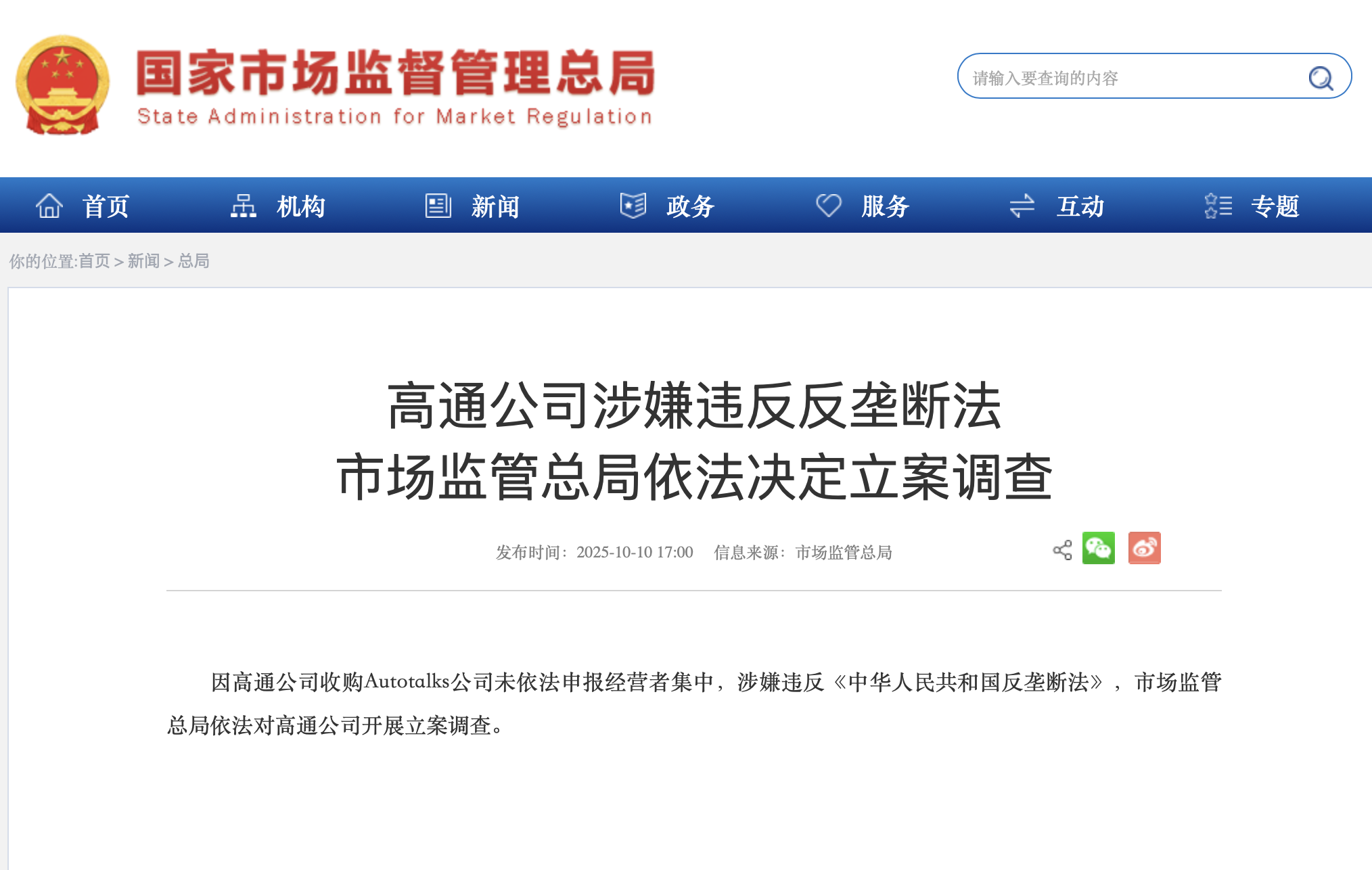 突发。 10月10日消息,因高通公司收购Autotalks公司未依法申报经营者集中,涉嫌违反《中华人民共和国反垄断法》,市场监管总局依法对高通公司开展立案调 查。 受此消息影响,高通股价盘前快速跳水,现跌超3%。 证券时报各平台所有原创内容,未经书面授权,任何单位及个人不得转载。我社保留追 究相关 行 为主体法律责任的权利。 转载与合作可联系证券时报小助理,微信ID:SecuritiesTimes END 综合自:市说新语、行情 责编:李丹 校对:杨舒欣 版权声明 点击关键字可查看 潜望系列深度报道丨 股事会专栏 丨 投资小红书 丨 e公司调查 丨 时报会客厅 丨 十大明星私募访谈 丨 刚刚!中方出手:对美船舶收取船舶特别港务费 丨 A 股,突变!科技股大调整! 丨 中东突发!黄金跳水! 丨 美联储主席最新发声! 丨 疯狂!两只股票暗盘涨疯了,最高暴拉880%! 丨 重磅!商务部、海关 总署连发4则公告 丨 暴涨超70%!301563,盘中狂飙! 丨 时隔10年,沪指突破3900点!芯片股,集体暴涨! 丨 盘前突发!商务部:对境外相关稀土物项 实施出口管制! 丨 深夜,全线上涨!黄金股爆发! ...