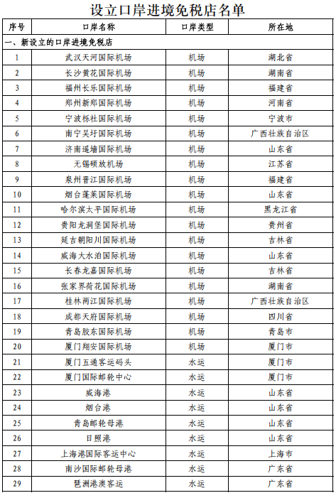 近日,财政部、商务部、文化和旅游部、海关总署、税务总局联合印发《关于口岸进境免税店有关事宜 的通知》(以下简称《通知》),设立调整一批口岸进境免税店。具体如下: 一、在武汉天河国际机场等41个口岸各新设1家口岸进境免税店。其中,横琴口岸进境免税店设立后, 允许自澳门进境居民旅客在该口岸进境免税店购买一定数量(15000元以内)的免税商品。 五、口岸进境免税店所在省(自治区、直辖市、计划单列市)人民政府应切实承担主体责任,加强统筹 协调,配套完善本地区综合管理机制,防范免税商品违规倒卖等扰乱市场经营秩序的行为,统筹做好反 走私综合治理工作,有效防控免税商品走私风险。 设立口岸进境免税店名单 | 序号 | 口岸名称 | 口岸类型 | 所在地 | | --- | --- | --- | --- | | | 一、新设立的口岸进境免税店 | | | | 1 | 武汉天河国际机场 | 机场 | 湖北省 | | 2 | 长沙黄花国际机场 | 机场 | 湖南省 | | 3 | 福州长乐国际机场 | 机场 | 福建省 | | 4 | 郑州新郑国际机场 | 机场 | 河南省 | | 5 | 宁波桥社国际机场 | 机场 | 宁波市 ...