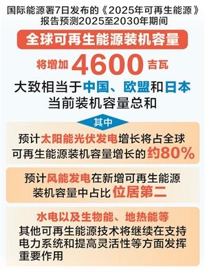 新华社巴黎10月7日电(记者罗毓)国际能源署7日发布的《2025年可再生能源》报告预测,尽管面临供 应链和资金压力、电网整合挑战和政策不确定性等不利因素,全球可再生能源装机容量仍将强劲增长, 预计未来5年全球可再生能源新增装机容量将达到之前5年增量的两倍。报告预测,2025至2030年期间, 全球可再生能源装机容量将增加4600吉瓦,大致相当于中国、欧盟和日本当前装机容量总和。报告显 示,未来5年,全球可再生能源增长主要由太阳能光伏产业带动,得益于低成本和审批流程提速,太阳 能光伏发电增长预计将占全球可再生能源装机容量增长的约80%。预计风能发电在新增可再生能源装机 容量中占比位居第二,尽管面临短期挑战,但随着供应瓶颈缓解和项目推进,风电仍将大幅增长,特别 是在中国、欧洲和印度。此外,水电以及生物能、地热能等其他可再生能源技术将继续在支持电力系统 和提高灵活性等方面发挥重要作用。报告说,在亚洲、中东和非洲的新兴经济体中,成本竞争力和更强 的政策支持正在刺激可再生能源更快增长,多国政府相继推出新的招标计划并提高发展目标。国际能源 署署长法提赫·比罗尔在一份公报中说,未来5年,除了成熟市场,预计太阳能光伏发电在沙 ...
