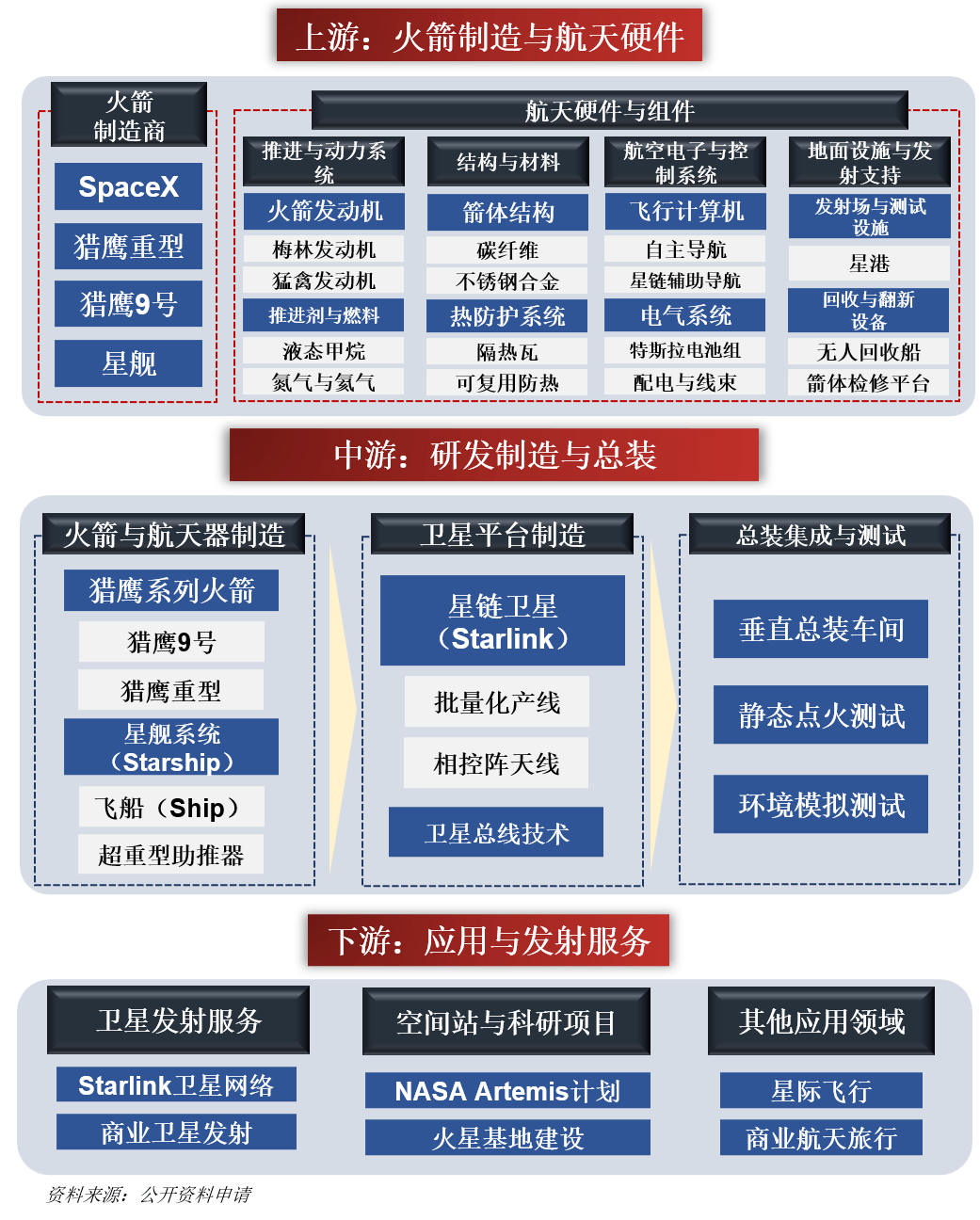 02 SpaceX 历史时刻 2002 年,马斯克出资 1 亿美元创立 SpaceX,核心愿景是降低太空发射成本、实现火星殖民。其发展历程可浓缩为四大关键阶段: 1. 初创期(2002-2008):绝境翻盘 Falcon 1 火箭连续三次试飞失败,公司濒临破产。2008 年第四次发射成功入轨,拿下 NASA 16 亿美元补给合同,绝境逢生。 2. 技术突破期(2008-2015):颠覆行业 01 SpaceX 产业链全景图 Falcon 9 成为主力火箭,2015 年实现一级助推器陆地回收,打破 "火箭一次性使用" 逻辑,将发射边际成本压至 1500-2000 万美元,建立成本优势。 3. 生态布局期(2015-2020):转型升级 启动星链、星舰计划,形成 "发射服务 + 星座运营" 双模式,从火箭服务商转型为太空基建商,星链成为全球最大低轨卫星星座。 4. 成熟扩张期(2020 - 至今):巨头成型 2023 年包揽美国近 90% 轨道发射任务, 2025 年星舰第十次试飞成功,奠定火星探索基础。同年确认 IPO 计划,估值超千亿美元。 03 业绩拆分 传统航天行业更像 "卖一次性工具"—— 要么卖整枚火 ...