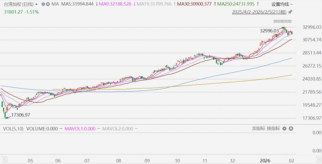 本文源自:金融界AI电报 台湾加权指数收涨1.5%,报32803.82点,再创历史新高,月内累涨13.26%。 ...