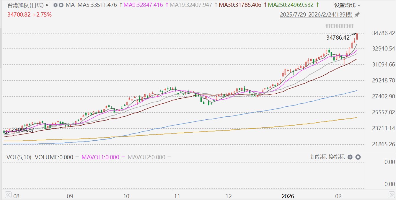 格隆汇2月24日|台湾加权指数盘中一度涨3%报34786.42点,创历史新高;最终收涨2.75%报34700.82点,5连升,创收盘历史新高。台湾加权指数年内累涨 19.81%。 ...