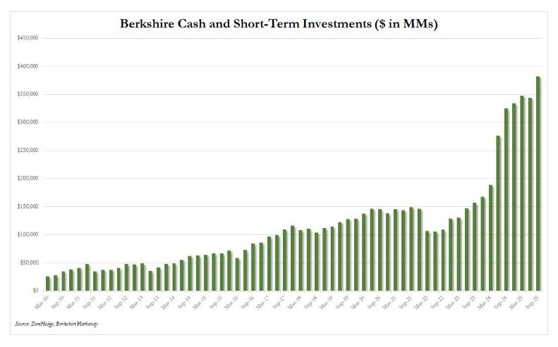 而这一数字的背后是公司的持续抛售。过去三年,伯克希尔已累计净卖出约1840亿美元的股票,仅在第三季度就再度抛售了价值61亿美元的普通 股。 95岁的巴菲特准备卸任交棒之际,伯克希尔·哈撒韦的现金储备正在创下新历史新高——3820亿美元。 11月1日周六,这家集团公布的最新财报显示,截至三季度集团现金储备达到3817亿美元,比上一季度增加了376亿美元,相当于每天增加4.2亿美 元现金,每小时1700万美元现金。 "在巴菲特看来,目前的机会并不多",Edward Jones的分析师Jim Shanahan对此评论道。 伯克希尔的最新财报似乎向市场传递了一个信号:在巴菲特眼中,当前市场的卖出机会可能远大于买入。 除了减持股票投资组合,伯克希尔在回购自家股票方面也保持了极大的克制。自2024年第二季度以来,公司便再未进行过任何回购。 这家横跨保险、铁路和公用事业等领域的巨头正以前所未有的谨慎姿态,通过持续抛售股票和暂停回购,积累了巨额"弹药",为即将到来的"后巴 菲特时代"留下了巨大的想象空间和挑战。 卖出远大于买入 具体到伯克希尔·哈撒韦的投资活动,在集团2832亿美元的股票投资组合中,其连续第12个季度卖出的股 ...