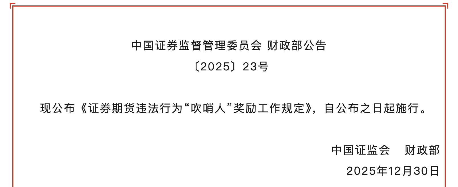 微信公众号"证监会发布"1月9日消息,中国证监会、财政部公布《证券期货违法行为"吹哨人"奖励工作 规定》,自公布之日起施行。 为深入贯彻党中央、国务院决策部署,进一步完善举报制度,有效回应市场关切,弘扬公正担当的"吹 哨人"文化,更好适应资本市场高质量发展和监管执法工作要求,结合举报工作实践,中国证监会会同 财政部修订完善了《证券期货违法违规行为举报工作暂行规定》(以下简称《举报规定》),形成了《证 券期货违法行为"吹哨人"奖励工作规定》(以下简称《"吹哨人"奖励规定》),现说明如下: 一、修订背景 2014年6月,我会发布实施《举报规定》,设立了重大违法线索有奖举报制度。2020年1月,《举报规 定》修订(证监会公告〔2020〕7 号)。近年来,一方面,中央高度重视资本市场举报制度建设,党中 央、国务院对完善证券期货违法违规举报制度提出了一系列新部署新要求。另一方面,随着我会持续释 放强监管信号,同时有奖举报条款正式写入《证券法》《期货和衍生品法》,社会和市场有关方面通过 各种方式向我会提出加大有奖举报力度打击违法行为的意见建议。为落实中央要求、回应市场关切,有 必要对《举报规定》进一步修订完善。 二、修订 ...