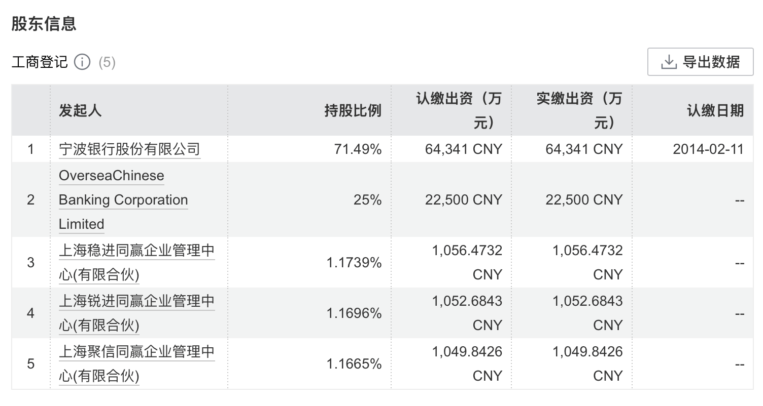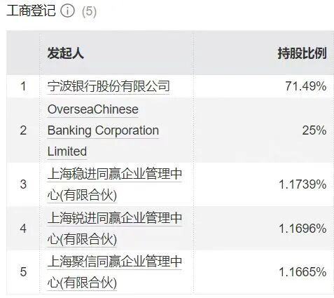 Wind信息显示,近日,永赢基金的股东序列中新增三家有限合伙企业,合计持有3.51%股权,系股东Oversea-Chinese Banking Corporation Limited(新加坡华 侨银行)转让后的结果。 中国证券报·中证金牛座记者从业内获悉,此次永赢基金股权变更是用于支持员工持股计划。此次股权变更完成后,宁波银行持股比例维持71.49%不变,仍 为永赢基金第一大股东;新加坡华侨银行持股比例调整为25%,仍是公司主要股东。新加坡华侨银行也是宁波银行的重要股东,一体化的股东结构或使永赢 基金推进持股计划更为高效、顺畅。 | | 发起人 | 精股比例 | 认缴出资(万 | 21 N | | --- | --- | --- | --- | --- | | | | | 元) | | | 1 | 宁波银行股份有限公司 | 71.49% | 64.341 CNY | 6 | | | OverseaChinese | | | | | 2 | Banking Corporation | 25% | 22.500 CNY | 2. | | | Limited | | | | | 3 | 上海稳进目赢少小贵强中 | ...