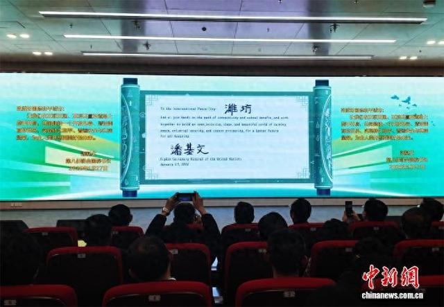 中新网潍坊2月3日电(沈广安) 获评"国际和平城市"五周年之际,潍坊于2月3日举办国际和平文化推广年 启动活动。活动现场,"和平记忆联盟"成立。 城市协会主席弗雷德·阿门特视频致辞。 沈广安 摄 "国际和平城市协会近500个会员城市,都为能与潍坊携手合作而感到自豪。"国际和平城市协会主席弗 雷德·阿门特在视频致辞中表示,潍坊在中国率先发布《潍坊市关于在普通中小学实施和平教育的意 见》,这是首份专门推广和平教育的正式文件,致力于培养青少年成为"构建人类命运共同体"的种子。 活动现场,美中航空遗产基金会中方理事高德敏和飞虎队队员后代杰西·米莱特共同讲述"飞虎队"故 事。现场播放了潍县集中营侨民后代祝贺视频。 五年前,上千只和平鸽在潍县乐道院·西方侨民集中营博物馆上空盘旋飞翔,见证潍坊被国际和平城市 协会正式认定为全球第308座"国际和平城市",这也是中国继南京之后的第二座"国际和平城市"。 八任秘书长潘基文发来和平寄语。沈广安 摄 当天,联合国第八任秘书长潘基文发来和平寄语,呼吁国际社会在互联互通、互利共赢的道路上携手并 肩,共同建设一个开放包容、清洁美丽的世界,实现持久和平、普遍安全与共同繁荣,为全人类开创更 ...