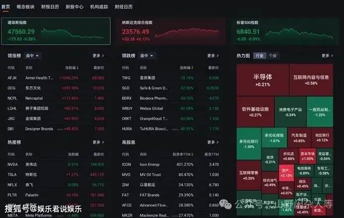大家好,欢迎回到《美股笔记》!今天是12月9日周二。 美股三大指数全天几乎玩了一整天的"心电图",窄幅波动,几乎平收。与其说是人在交易,不如说是机 器人在互殴。这种横盘等方向的日子,空气里都弥漫着一股不必要的紧张感。 | 普页 | 概念板块 财报日历 | 新股中心 | 机构造窟 财经日历 | | | | | | | | | | | --- | --- | --- | --- | --- | --- | --- | --- | --- | --- | --- | --- | --- | | 通琼斯指数 | | | | 后斯达克赫合指数 | | | | 标题500指数 | | | | | | 47560.29 | | | | 23576:49 | | | | 6840.51 0 | | | | | | -179.03 -0.38% | | | | #30.58 +0.731 | | | | =6.00 -0.09% | | | | | | 领涨榜 盘中 ▼ | | | 更多> | 领跌榜 | 盘中 ▼ | | 更多 > | 热力图 行业 个股 | | | | 更多 > | | 代码 | 名称 | 最近44 | 机 ...
