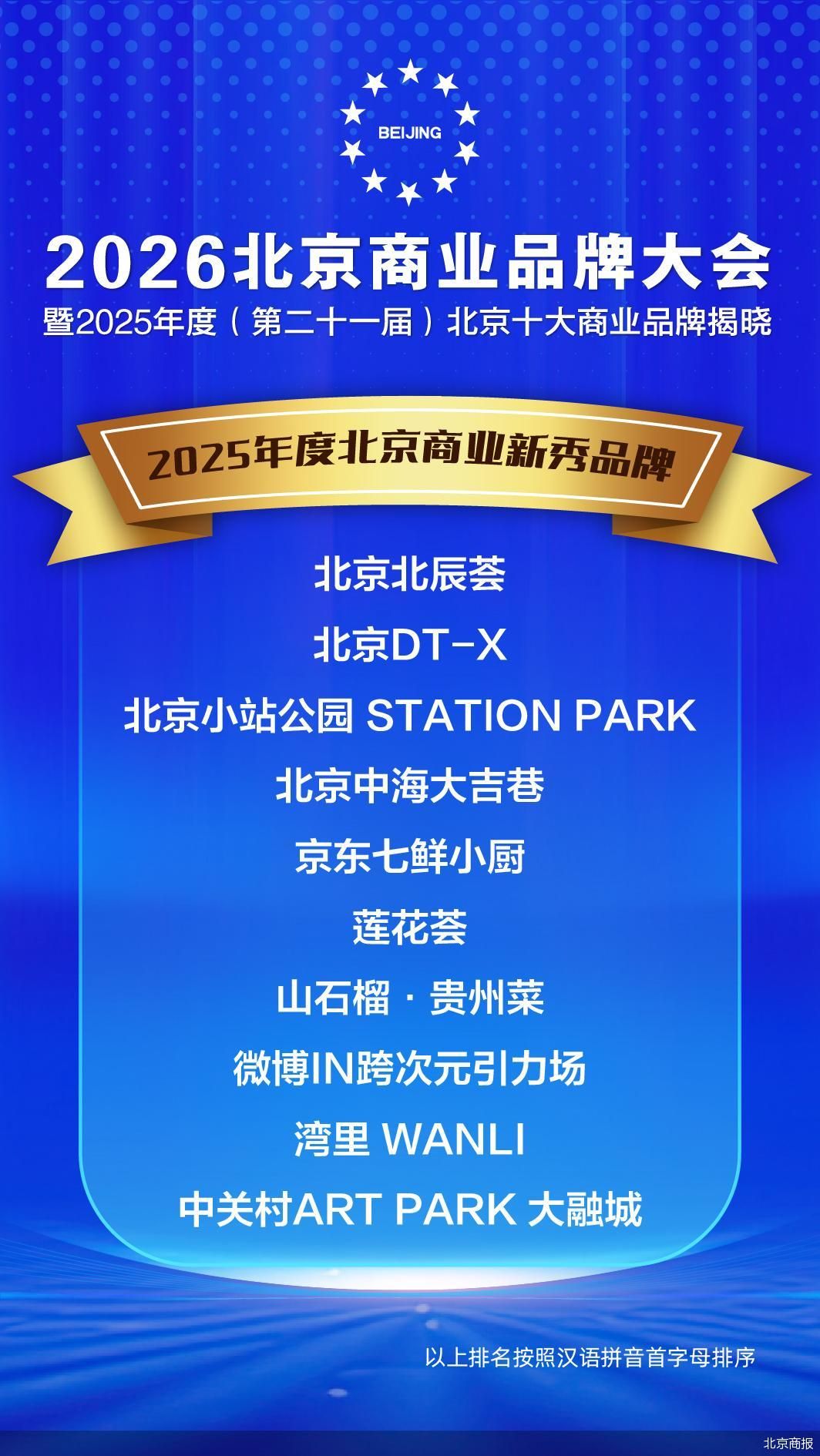 "2025年度北京十大商业品牌"作为主榜单,代表入围品牌在市场综合影响力大,引领行业发展方向;四个常设子榜单分别为2025年度"北京商业品质服 务品牌""北京商业模式创新品牌""北京商业匠心智造品牌"与"北京商业新秀品牌"。本届活动首次引入三大年度特设榜单,即2025年度"金融产品创新赋 能消费优秀案例""北京文商旅体融合优秀案例"和"北京时尚消费力引领品牌"。 北京商报讯(记者 王维祎)1月16日,由北京市商务局指导,北京日报报业集团和北京市商业联合会共同主办,北京商报社承办的2026北京商业品牌大 会暨2025年度(第二十一届)北京十大商业品牌揭晓活动在北京国际饭店成功举办。本次活动以"新需求 新供给"为主题,政府领导、商业专家及企业 高层代表齐聚一堂,共同见证了代表北京商业最高水平的"2025年度北京十大商业品牌"及四个常设子榜单的揭晓。 其中,北京北辰荟、北京DT-X、北京小站公园STATION PARK、北京中海大吉巷、京东七鲜小厨、莲花荟、山石榴·贵州菜、微博IN跨次元引力场、湾 里WANLI、中关村ART PARK大融城10家品牌荣膺"2025年度北京商业新秀品牌"。伴随消费需求日益多元,京城商 ...