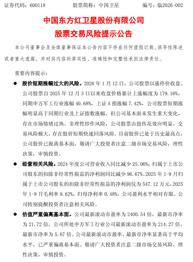 Core Viewpoint - The commercial aerospace sector has experienced a significant correction after a period of rapid growth, with several stocks hitting the daily limit down. Group 1: Market Performance - The Wind Commercial Aerospace Theme Index saw a remarkable increase of 89% from December 1, 2025, to January 12, 2026, leading to nearly 20 stocks doubling in value during this period [1] - China Satellite's stock closed at the limit-up price on January 12, 2026, with a cumulative increase of 179.16% since December 3, 2025, significantly outperforming the 40.68% rise in the Shenwan Military Industry Index and the 7.42% increase in the Shanghai Composite Index [4] Group 2: Risk Warnings - China Satellite issued a risk warning, indicating that its stock price is at a historical high and detached from its fundamentals, urging investors to be cautious of trading risks [7] - Other companies in the commercial aerospace sector, including Aerospace HuanYu, Aerospace Electronics, and others, have also issued warnings about trading risks due to significant short-term price increases and high turnover rates [7] - Aerospace HuanYu's stock rose by 265.82% since November 21, 2025, while the Shenwan National Defense Industry Index increased by 44.76% and the Shanghai Composite Index by 8.62%, indicating a potential for market overheating and irrational speculation [8] - Aerospace Electronics reported a 194.40% increase since November 27, 2025, also highlighting the lack of fundamental changes and the risks associated with market sentiment [8]