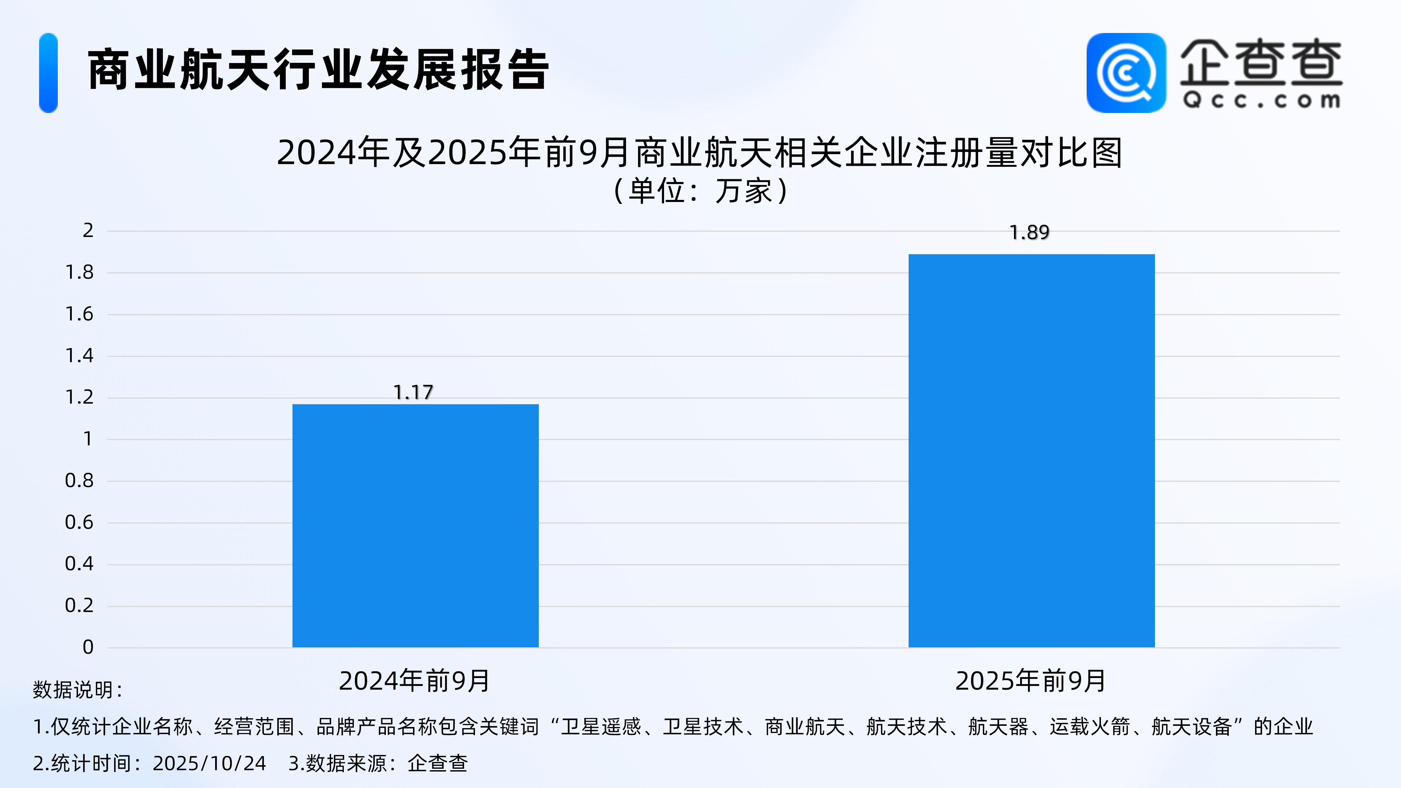 据北京商报报道,近期,一批国产商业火箭陆续完成飞行试验任务,中科宇航、星河动力、星际荣耀、东方空间等商业火箭公司均有火箭发射任务圆满 完成或待执行。与此同时,商业航天企业IPO进程也明显提速。有相关专家表示,如果把过去十年的商业航天比作一条加速跑道,那么当前正从"可发射、 可交付"的验证期,跨入"有频次、能交付、讲效率"的规模化爬升期。企查查数据显示,国内现存商业航天相关企业8.82万家。注册量方面,近十年相关企 业注册量呈整体增长态势,2024年全年注册相关企业1.64万家,截至目前,今年已注册2万家相关企业,远超去年全年注册量,其中前9月注册1.89万家,同 比增长62.30%。存量方面,从经营时间来看,商业航天相关企业多成立于近三年,成立年限在1-3年的相关企业最多,占比30.35%。从城市线级分布来看, 商业航天相关企业多分布在新一线城市,占比达30.78% 1.今年前9月注册量同比增长62.30% 企查查数据显示,从经营时间来看,商业航天相关企业多成立于近三年,成立年限在1-3年的相关企业最多,占比30.35%。其次,成立年限在1年内的相 关企业占比26.46%。 3.相关企业多分布在新一线城市 一 ...