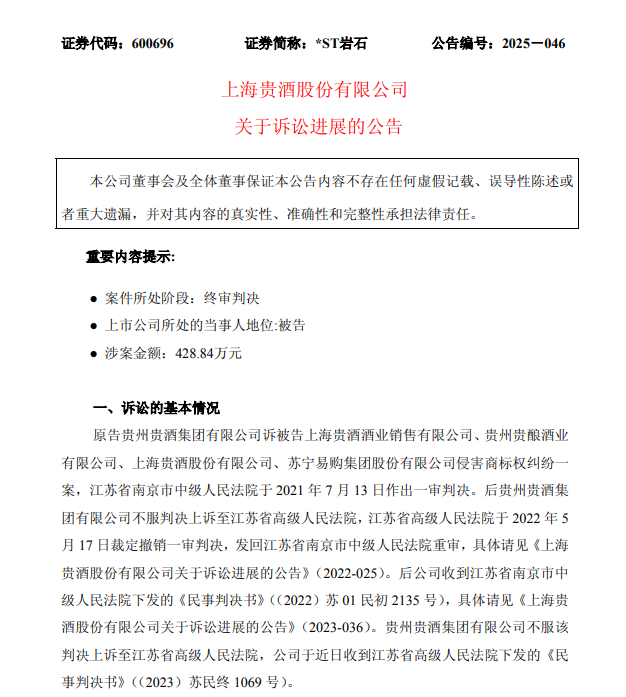 投资快报记者张厚培 广州报道 10月10日,上海贵酒股份有限公司(证券简称" *ST岩石 ", 证券代码"600696.SH")发布关于诉讼进展 的公告。公告显示,上海贵酒与贵州贵酒关于"贵酒"商标纠纷一案的终审判决结果出炉,上海贵酒作为 被告方败诉且需赔偿贵州贵酒相关经济损失,且不得使用"贵酒"这一企业名称。 江苏省高级人民法院下发的《民事判决书》主要内容之一,撤销江苏省南京市中级人民法院(2022)苏 01民初2135号民事判决;并裁定上海贵酒股份有限公司、贵州贵酿酒业有限公司、上海贵酒酒业销售有 限公司、上海贵酒云电子商务有限公司立即停止侵害贵州贵酒集团有限公司第1223571号、第8550010 号,第9784875号注册商标专用权的行为;裁定上海贵酒股份有限公司、上海贵酒酒业销售有限公司立 即停止使用贵州贵酒集团有限公司有一定影响的企业名称"贵酒"; 裁定上海贵酒股份有限公司、贵州 贵酿酒业有限公司、上海贵酒酒业销售有限公司、上海贵酒云电子商务有限公司于判决生效之日起十日 内赔偿贵州贵酒集团有限公司经济损失及合理维权费用共计418.847万元。 资料显示,贵州贵酒前身系1950年成立的国营贵阳酒厂, ...