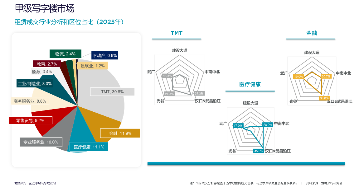 Core Insights - The Wuhan Grade A office market is expected to experience a significant increase in supply, with approximately 1.12 million square meters set to be added over the next four years, primarily concentrated in the Hankou and Wuchang riverside areas [1][4]. Grade A Office Market Overview - In 2025, the Wuhan Grade A office market will see an addition of about 230,000 square meters, raising the total stock in the core business district to 3.433 million square meters [4]. - The TMT (Technology, Media, and Telecommunications) sector is projected to be the main driver of leasing activity, accounting for 35.9% of the new space leased in 2025 [4][6]. - Average rental rates for Grade A offices in Wuhan fell to 73.3 yuan per square meter per month, a decrease of 11.2% year-on-year, while the vacancy rate rose to 39.1%, an increase of 2.7 percentage points compared to the previous year [5]. Market Dynamics and Trends - The overall demand for Grade A office space in Wuhan is undergoing a phase of contraction due to cautious expansion attitudes among companies, with a net absorption of 59,000 square meters in 2025, reflecting a year-on-year decline of 33.4% [5][6]. - Operators are adopting diversified leasing strategies, including co-working spaces and customized services, to attract tenants amid rising competition and increased vacancy rates [5][6]. Sector-Specific Demand - The main sectors supporting the Grade A office leasing market in 2025 are TMT, finance, and healthcare, contributing 30.6%, 11.9%, and 11.1% respectively to the leasing activity [6]. - Cost control remains a core driver for relocations, accounting for 58.3% of demand, while new demand remains limited [6]. Future Outlook - The competition in the Grade A office market is expected to intensify, particularly along the Yangtze and Han rivers, challenging landlords to enhance operational efficiency and differentiate their offerings [6].