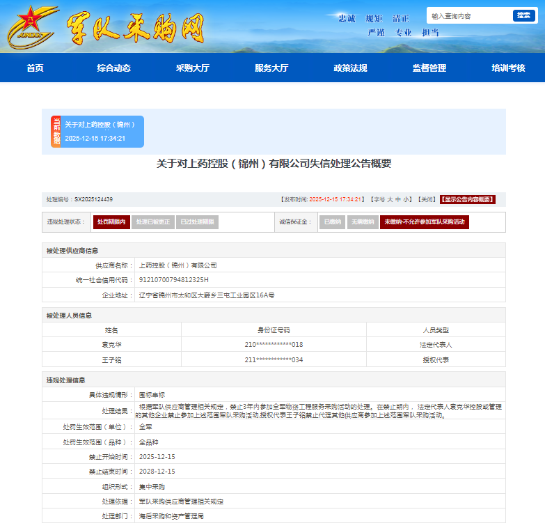 齐鲁晚报·齐鲁壹点记者于军队采购网了解到,12月15日,上药控股(锦州)有限公司上榜军队采购失信名单,处理部门为海后采购和资产管理局。处罚 生效范围(单位):全军;处罚生效范围(品种):全品种。 据失信处理公告内容,上药控股(锦州)有限公司的具体违规情形为"围标串标"。违规情况显示,经调查核实,上药控股(锦州)有限公司在参加项目编 号2024-JH13-W1002采购活动中,存在围标串标等违规行为。其处理编号为SX2025124439,违规处理状态:处罚期限内。 处理部门根据军队供应商管理相关规定,作出禁止其在3年内参加全军物资工程服务采购活动的处罚。以上处理自2025年12月15日起算。在禁止期内,其 时任法定代表人袁克华控股或管理的其他企业禁止参加上述范围军队采购活动,授权代表王子铭禁止代理其他供应商参加上述范围军队采购活动。 据上药控股(锦州)有限公司官网介绍,现公司是集药品分销、营销服务、医疗器械于一体的大型医药商业企业。公司药品主要经营中成药、化学药制 剂、化学原料药、抗生素、生化药品、生物制品、第二类精神药品制剂、蛋白同化制剂、肽类激素,年销售额9000万元左右。 国家企业信用信息公示系统显示,上 ...