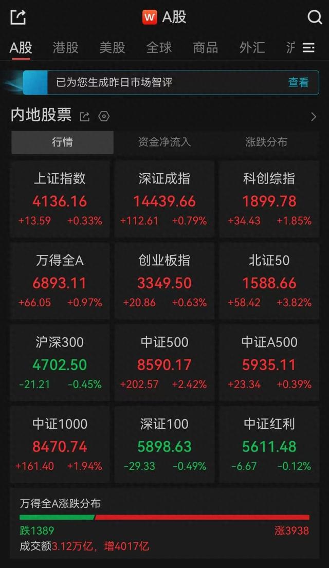 23日,A股三大指数高开,全天震荡,尾盘集体收涨。截至下午收盘,沪指涨0.33%,深证成指涨 0.79%,创业板指涨0.63%。 | L | | w A股 | | | Q | | --- | --- | --- | --- | --- | --- | | A股 美股 | 港股 | 全球 | 商品 | 外汇 汁 三 | | | 已为您生成昨日市场智评 | | | | 查看 | | | 内地股票 △ ⊙ | | | | | | | 行情 | | 资金净流入 | | 涨跌分布 | | | 上证指数 | | 深证成指 | | 科创综指 | | | 4136.16 | | 14439.66 | | 1899.78 | | | +13.59 +0.33% | | +112.61 +0.79% | | +34.43 +1.85% | | | 万得全A | | 创业板指 | | 北证50 | | | 6893.11 | | 3349.50 | | 1588.66 | | | +66.05 +0.97% | | +20.86 +0.63% | | +58.42 +3.82% | | | 沪深300 | | 中证500 | | ...