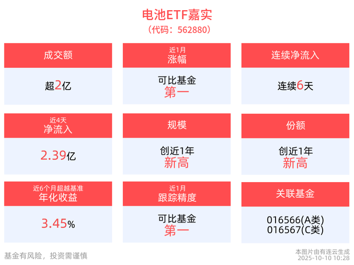 规模方面,电池ETF嘉实最新规模达15.88亿元,创成立以来新高。份额方面,电池ETF嘉实最新份额达 17.92亿份,创成立以来新高。从资金净流入方面来看,电池ETF嘉实近6天获得连续资金净流入,最高 单日获得1.17亿元净流入,合计"吸金"2.61亿元。 截至2025年10月10日 10:28,中证电池主题指数下跌4.79%。成分股方面,先导智能领跌,上能电气、 赢合科技、孚能科技、天赐材料跟跌。电池ETF嘉实(562880)下修调整。拉长时间看,截至2025年10月9 日,电池ETF嘉实近2周累计上涨6.83%,涨幅排名可比基金第一。 流动性方面,电池ETF嘉实盘中换手18.73%,成交2.92亿元,市场交投活跃。拉长时间看,截至10月9 日,电池ETF嘉实近1周日均成交1.86亿元。 | 股票代码 | 股票简称 | 涨跌幅 | 权重 | | --- | --- | --- | --- | | 300274 | 阳光电源 | -2.85% | 10.28% | | 300750 | 宁德时代 | -4.44% | 9.64% | | 002050 | 三花智控 | -4.72% | 6.31% | | 3 ...