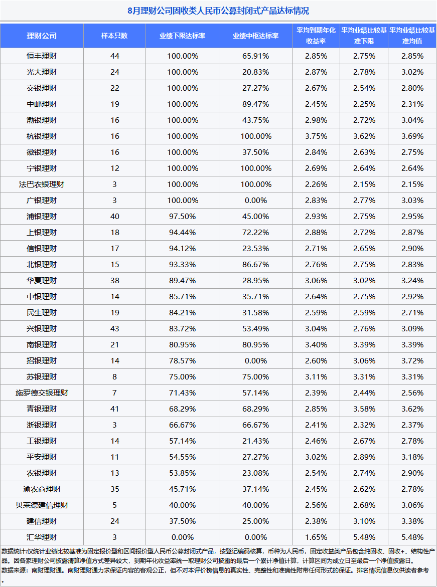 在市场利率走低、10年期国债收益率跌破2%的背景下,理财公司加大权益投资已成为必然选择。随着去年"9.24"一揽子金 融政策出台,国内资本市场出现重大转变,市场信心明显提振。一年过后,主要指数全线飙升,超1400只个股股价实现翻 倍。面对市场站上3800点后的震荡与板块轮动,投资者的收益体验就像坐过山车。能否既驾驭波动、跟上市场步伐,又让 持有过程更从容,实现收益与体验的"鱼与熊掌兼得"? 具体来看,恒丰理财8月到期的44只封闭式人民币固定收益类公募理财全部达到业绩比较基准下限,算术平均到期年化收益 率为2.85%。其中,恒丰理财"恒仁安盈固收增强封闭式第6期私行专属"到期年化收益率最高,为3.79%。该产品属于恒丰理 财的恒仁安盈固收增强系列。(详情见2025年9月18日发布的《8月报:权益类理财迎来扩容,今年以来平均收益率达 13%》)"安盈固收增强"历史达标率100% 恒丰理财恒仁安盈固收增强系列于2023年10月推出,定位为权益资产占比不超过10%的"固收+多资产"理财产品,投资期限 集中在18个月上下,内部风险评级为二级(中低风险)。该系列产品将90%以上资产配置于固定收益类资产,权益类资产配置 比 ...