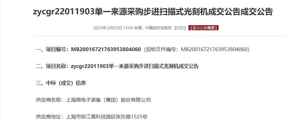 2025年年末,国产半导体赛道传来振奋人心的消息。 12月25日,中国政府采购网公示的一则中标公告显示,国内光刻机领域领军企业上海微电子装备(集团)股份有限公司,成功斩获 zycgr22011903采购项目,以1.1亿元的成交价将一台SSC800/10型步进扫描式光刻机订单收入囊中。这则年末传来的捷报,不仅为2025 年国产半导体设备产业的发展画上圆满句点,更向市场释放了国产核心设备市场化落地的强烈信号,为赛道注入强劲信心。 作为芯片制造链条中"卡脖子"的关键环节,步进扫描式光刻机的国产化进程一直备受产业链关注。 尽管此次中标设备的核心参数尚未完全披露,但从型号与产品定位来看,SSC800/10型设备的成功中标,已然印证了上海微电子技术 路线的可行性与市场化能力。深耕光刻机领域多年的上海微电子,早已构建起覆盖封装、面板等多领域的产品矩阵,此前推出的多款 设备已实现成熟制程的国产化配套,为国内晶圆厂、科研机构提供了可靠的本土选择。此次政府采购订单的落地,更是将其技术实力 与产品认可度推向了新的高度,标志着国产光刻机在核心订单突破上实现阶段性跨越。 当前全球半导体设备贸易壁垒高筑,高端光刻机供应持续受限,在此背景 ...