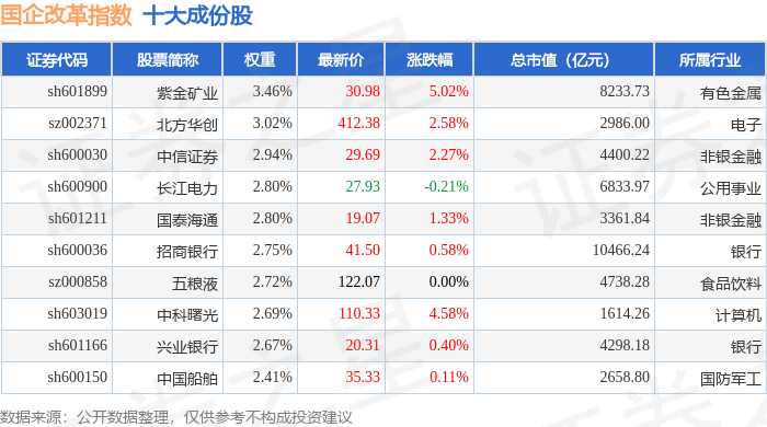 证券之星消息,10月15日,国企改革(399974)指数报收于1924.72点,涨0.95%,成交1887.8亿元,换 手率0.92%。当日该指数成份股中,上涨的有65家,生益科技以10.0%的涨幅领涨,下跌的有30家,西部 超导以4.36%的跌幅领跌。 资金流向方面,国企改革(399974)指数成份股当日主力资金净流入合计18.71亿元,游资资金净流出合 计3.72亿元,散户资金净流出合计14.99亿元。成份股资金流向详情见下表: | 代码 | 名称 | 主力净流入(元) | 主力净占比 游资净流入 (元) | | 游资净占比 散户净流入(元) | | 散户净占比 | | --- | --- | --- | --- | --- | --- | --- | --- | | 000625 | 长安汽车 | 6.51 Z ﮯ | 20.30% | -2.65 Z | -8.27% | -3.86 Z | -12.03% | | 668109 | 紫金矿业 | 5.63 Z | 5.09% | -3.58亿 | -3.24% | -2.05 Z | -1.86% | | 600030 | 中信证券 | 4.88 Z ...