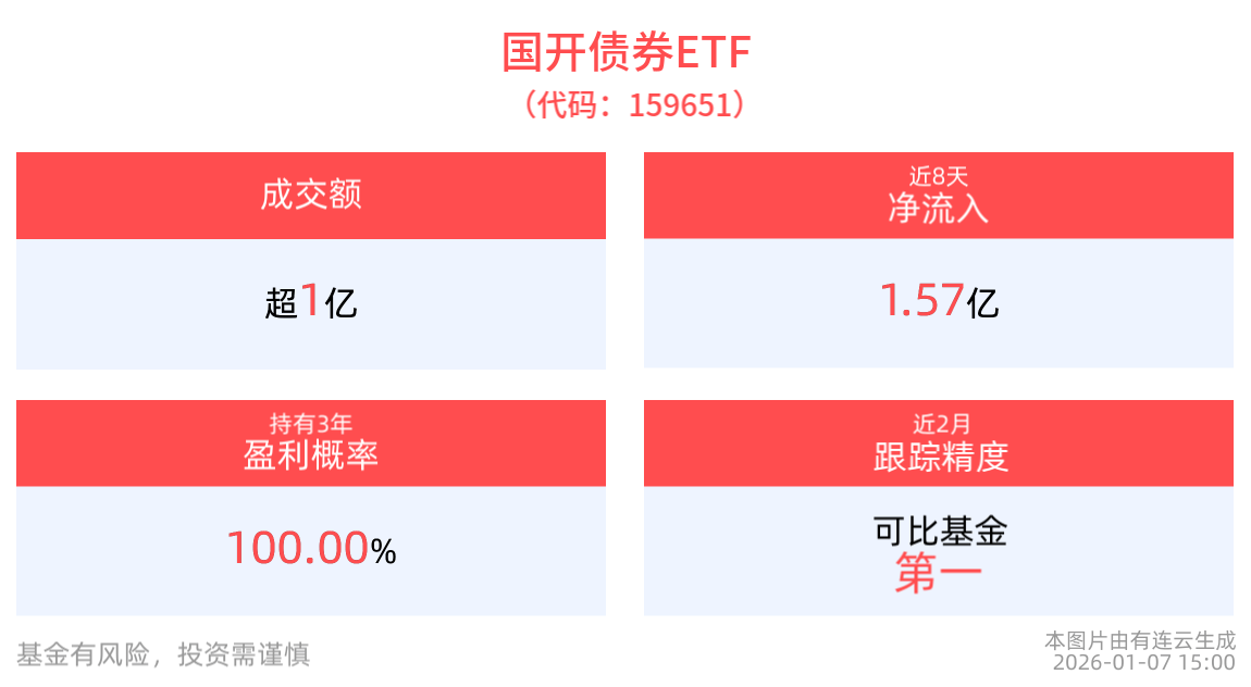 机构认为,当前10年国债接近1.9%,30年到达2.335%,超长国债和地方债已经具备配置价值,如果10年国债突破1.9%,建议可以关注超长端配置价值和长 端短期反弹价值,可以结合权益和商品行情来把握入场节奏。另外,3-5年二永的持有价值依然较高,后续市场平稳后,预计证金-国债利差也还是会压缩。 截至2026年1月7日 15:00,国开债券ETF(159651)上涨0.02%,最新价报106.78元。 流动性方面,国开债券ETF盘中换手18.9%,成交1.30亿元,市场交投活跃。拉长时间看,截至1月7日,国开债券ETF近1年日均成交2.84亿元。 资金流入方面,国开债券ETF最新资金净流出2498.73万元。拉长时间看,近8个交易日内,合计"吸金"1.57亿元。(数据来源:Wind) 回撤方面,截至2026年1月7日,国开债券ETF今年以来最大回撤0.04%,相对基准回撤0.00%。 费率方面,国开债券ETF管理费率为0.15%,托管费率为0.05%,费率在可比基金中最低。 跟踪精度方面,截至2026年1月7日,国开债券ETF近2月跟踪误差为0.009%,在可比基金中跟踪精度最高。 国开债券ETF紧密跟踪中债 ...