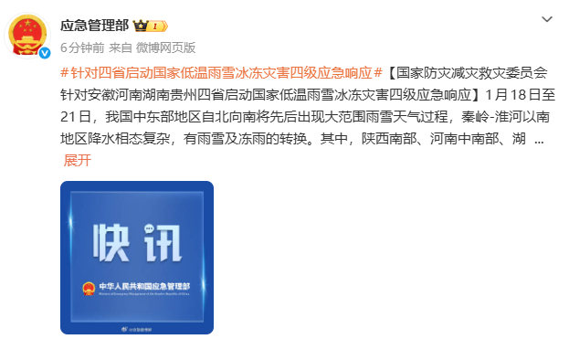 应急管理部:针对四省启动国家低温雨雪冰冻灾害四级应急响应