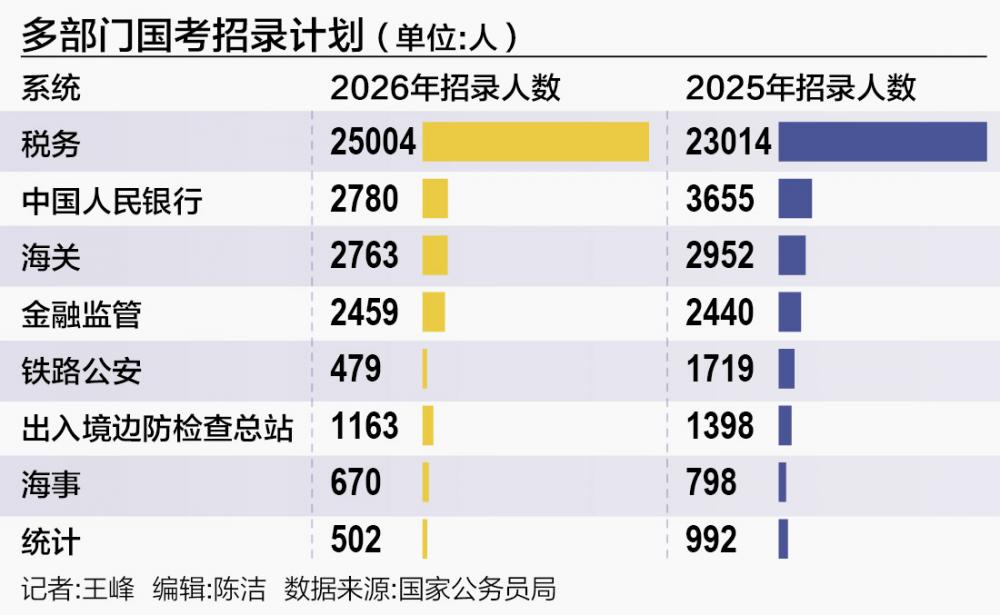 记者丨王峰 编辑丨陈洁 10月15日,2026年国家公务员考试(以下简称"2026年国考")报名正式开始,职位情况和报 考条件也已公布。 2026年国考共招录38119人、20714个职位,招录规模比上年略降,但作为招录主力的税务系 统逆势上涨,扩招近两千人,行政执法类职位占比也比上年提升,广东继续位列招录人数第一 大省。 高校毕业生是国考重点人群,超六成职位明确将报考门槛限定为"应届毕业生"。财政学类、经 济学类、金融学类专业的毕业生可报职位较多,可谓利好。 但专家指出,考生如何选岗,既需要考虑自身条件,也需要考虑长远发展,还需要兼顾竞争情 况。 | 多部 J国有指求计划 (単位:人) | | | | --- | --- | --- | | 系统 2026年招录人数 | | 2025年招录人数 | | 税务 | 25004 | 23014 | | 中国人民银行 | 2780 | 3655 | | 海关 | 2763 | 2952 | | 金融监管 | 2459 | 2440 | | 铁路公安 | 479 | 1719 | | 出入境边防检查总站 1163 | | 1398 | | 海事 | 670 | 79 ...