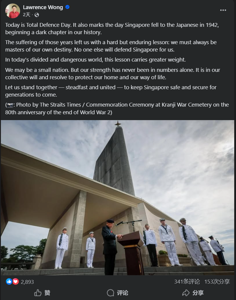 2月15日,新加坡总理黄循财在社交媒体"脸书"发文,在纪念新加坡的全面防卫日的同时,也回顾了新加坡被日本 占领的历史。 黄循财在当天的贴文中表示:今天是全面防卫日。这也标志着新加坡在1942年落入日本手中的一天,开启了我们 历史上的黑暗篇章。当年的苦难岁月给新加坡留下了沉重而深刻的教训。"我们必须时刻掌握自己的命运。除我们 自己以外,没人会替我们保卫新加坡。" 黄循财进一步强调:"在当今分裂且充满危险的世界里,这一教训更显重要。新加坡虽是小国,但国家的力量从来 不只在于人数,而在于全民守护家园、捍卫生活方式的集体意志与决心。" 1942年2月15日,日本攻陷新加坡,占据长达3年多。据不完全统计,在此期间,至少有5万新加坡华人被日军杀 害。1967年2月15日,新加坡建成"日本占领时期死难人民纪念碑",并将这一天定为"全面防卫日"。此后,新加坡 中华总商会已连续59年在2月15日主办相关公祭活动,成为年度重要纪念仪式之一。 本文系观察者网独家稿件,未经授权,不得转载。 ...
