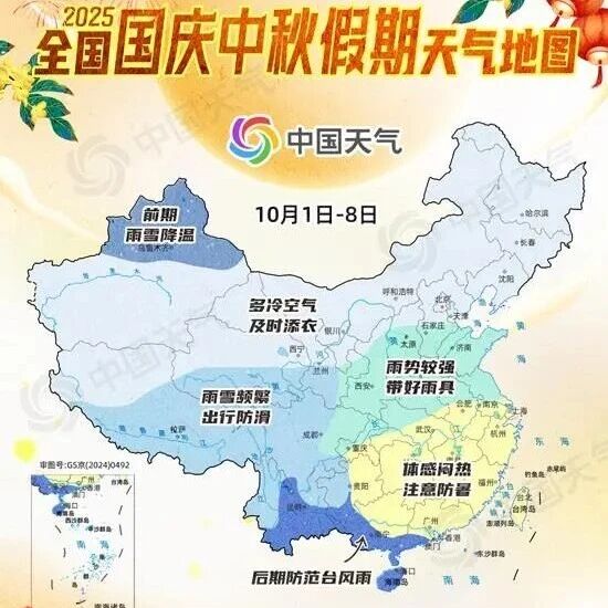 假期期间,受频繁冷空气影响,北方多地气温下降,新疆、甘肃、内蒙古等地还可能 出现沙尘天气。其中,10月1日至4日,将有两股弱冷空气先后来袭,新疆北部等地部 分地区将有明显降温,局地降温幅度可达10℃以上。5日后冷空气实力增强,降温波及 范围广,北方大部将出现4至8℃降温,局地降温幅度可超10℃。北方地区昼夜温差逐 渐拉大,建议公众采用"洋葱式"穿衣法,早晚外出需适当添衣。 不同于北方的寒凉,假期期间江南、华南等地闷热在线,湖南、江西、浙江、福建、 广东等地还可能出现35℃及以上的高温天气,公众需持续警惕"秋老虎",做好防暑降 温工作。 降水方面,华西、黄淮、华南南部等地假期期间将维持多雨格局。其中,四川东部、 陕西南部、河南、山东等地秋雨连连,假期前半段部分地区累计雨量大。根据最新预 报,目前有一个新的台风胚胎正在酝酿中,预计10月4日前后进入南海东北部海域,5 日起将陆续给华南南部至云南南部等地带去较强风雨天气,海南、广东西南部、广西 南部、云南南部等地或有暴雨或大暴雨。计划前往上述地区的小伙伴外出随身携带雨 具,注意防范道路湿滑、能见度降低等对出行的不利影响。 来源:中国天气网 国庆、中秋双节叠加,长达8 ...