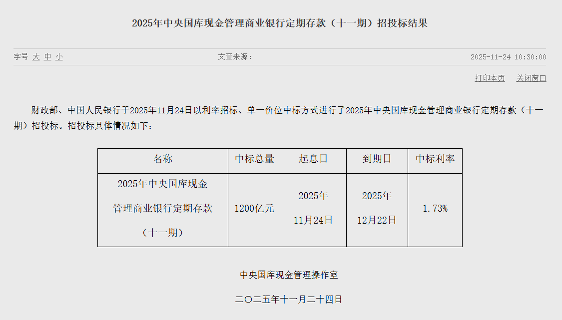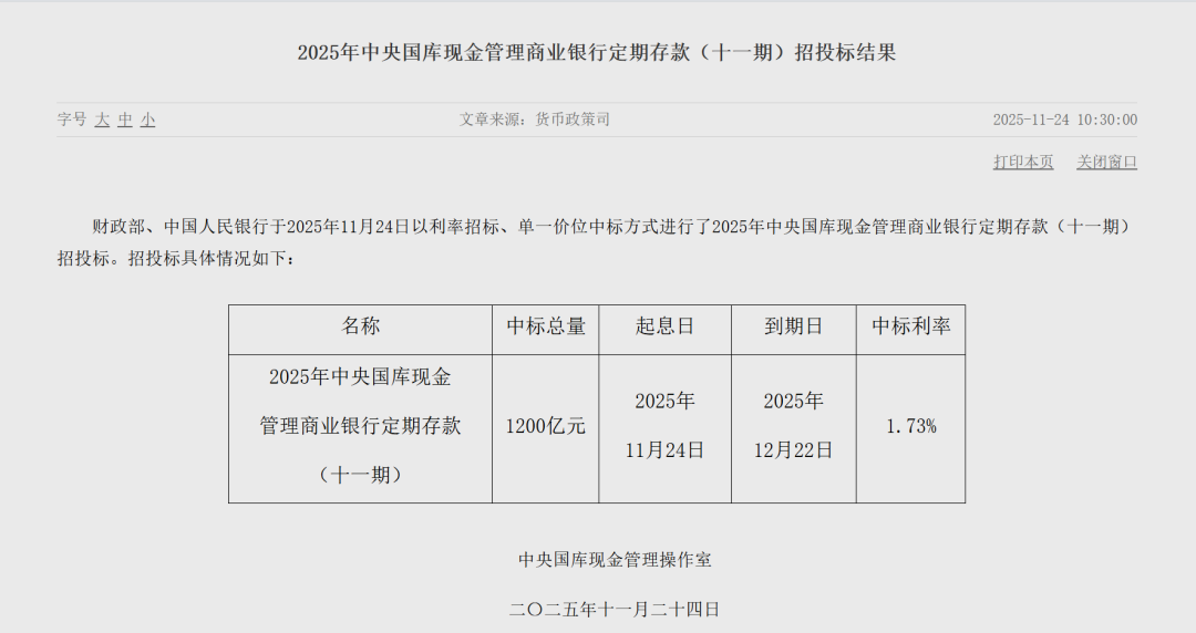 智通财经APP获悉,11月24日,财政部、中国人民银行于2025年11月24日以利率招标、单一价位中标方式进行了2025年中央国库现金管理商业银行定期存款 (十一期)招投标。中标总量1200亿元,2025年11月24日起息,2025年12月22日到期,中标利率1.73%。 | 名称 | 中标总量 | 起息日 | 到期日 | 中标利率 | | --- | --- | --- | --- | --- | | 2025年中央国库现金 | | 2025年 | 2025年 | | | 管理商业银行定期存款 | 1200亿元 | | | 1.73% | | | | 11月24日 | 12月22日 | | | (十一期) | | | | | 本文编选自"中国人民银行官网",智通财经编辑:徐文强。 ...